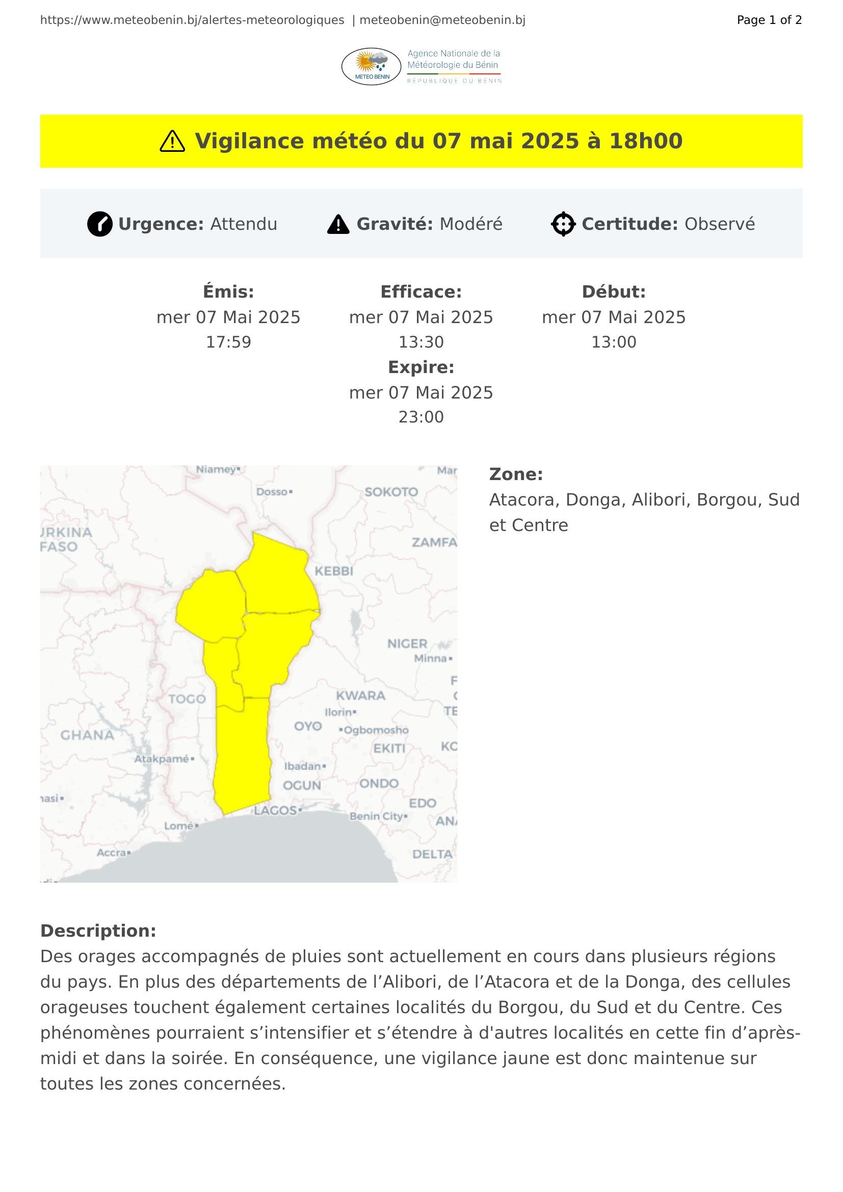 Des orages accompagnés de pluies sont actuellement en cours dans plusieurs régions du pays. En plus des départements de l’Alibori, de l’Atacora et de la Donga, des cellules orageuses touchent également certaines localités du Borgou, du Sud et du Centre. Ces phénomènes pourraient s’intensifier et s’étendre à d'autres localités en cette fin d’après-midi et dans la soirée. En conséquence, une vigilance jaune est donc maintenue sur toutes les zones concernées.