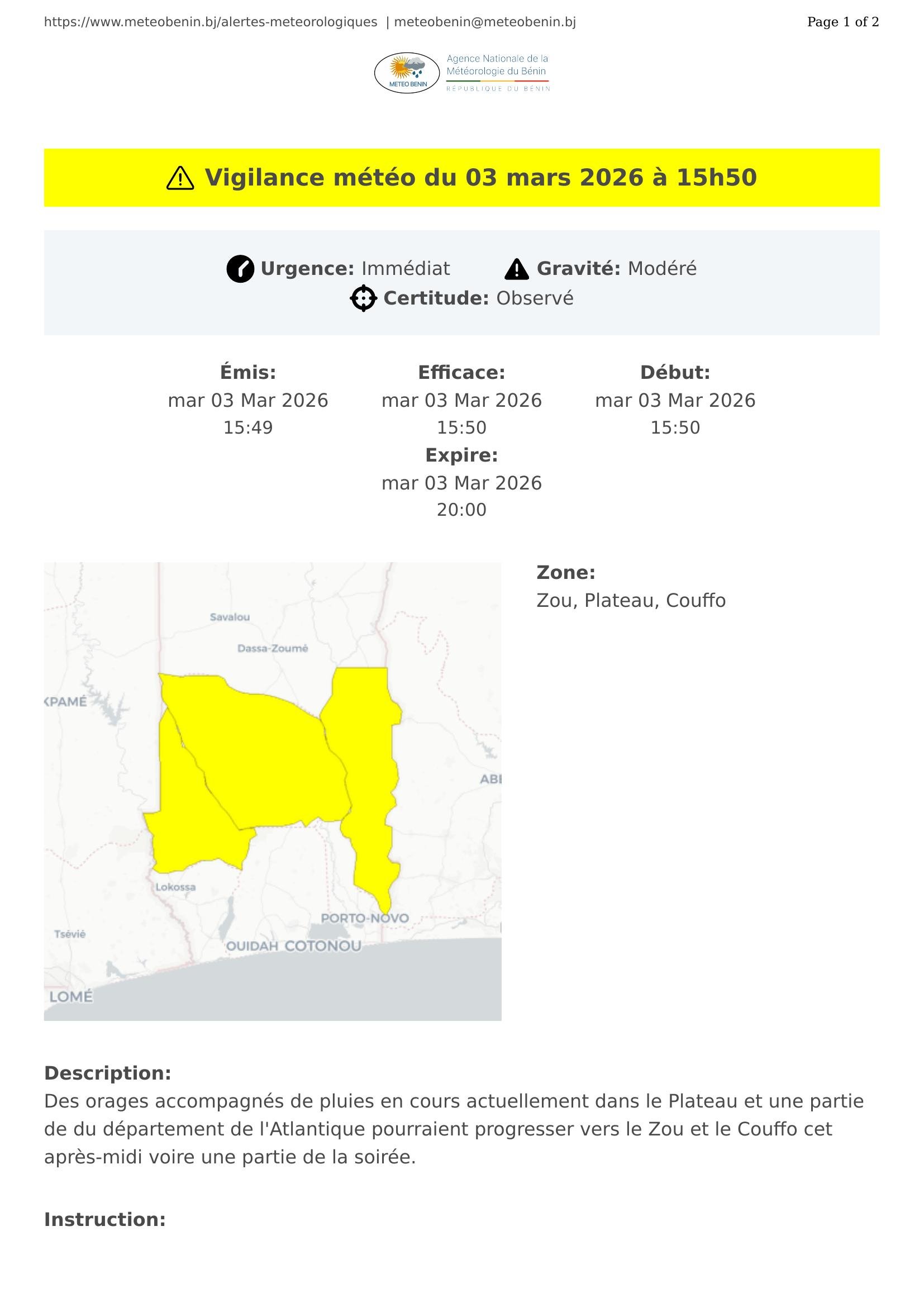 Des orages accompagnés de pluies en cours actuellement dans le Plateau et une partie de du département de l'Atlantique pourraient progresser vers le Zou et le Couffo cet après-midi voire une partie de la soirée.