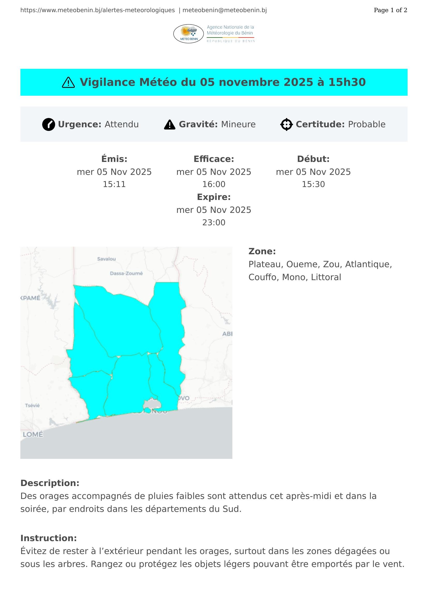 Vigilance Météo du 05 novembre 2025 à 15h30