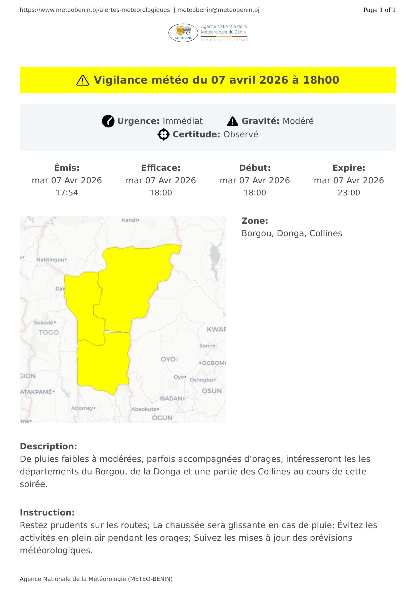 De pluies faibles à modérées, parfois accompagnées d’orages, intéresseront les les départements du Borgou, de la Donga et une partie des Collines au cours de cette soirée.