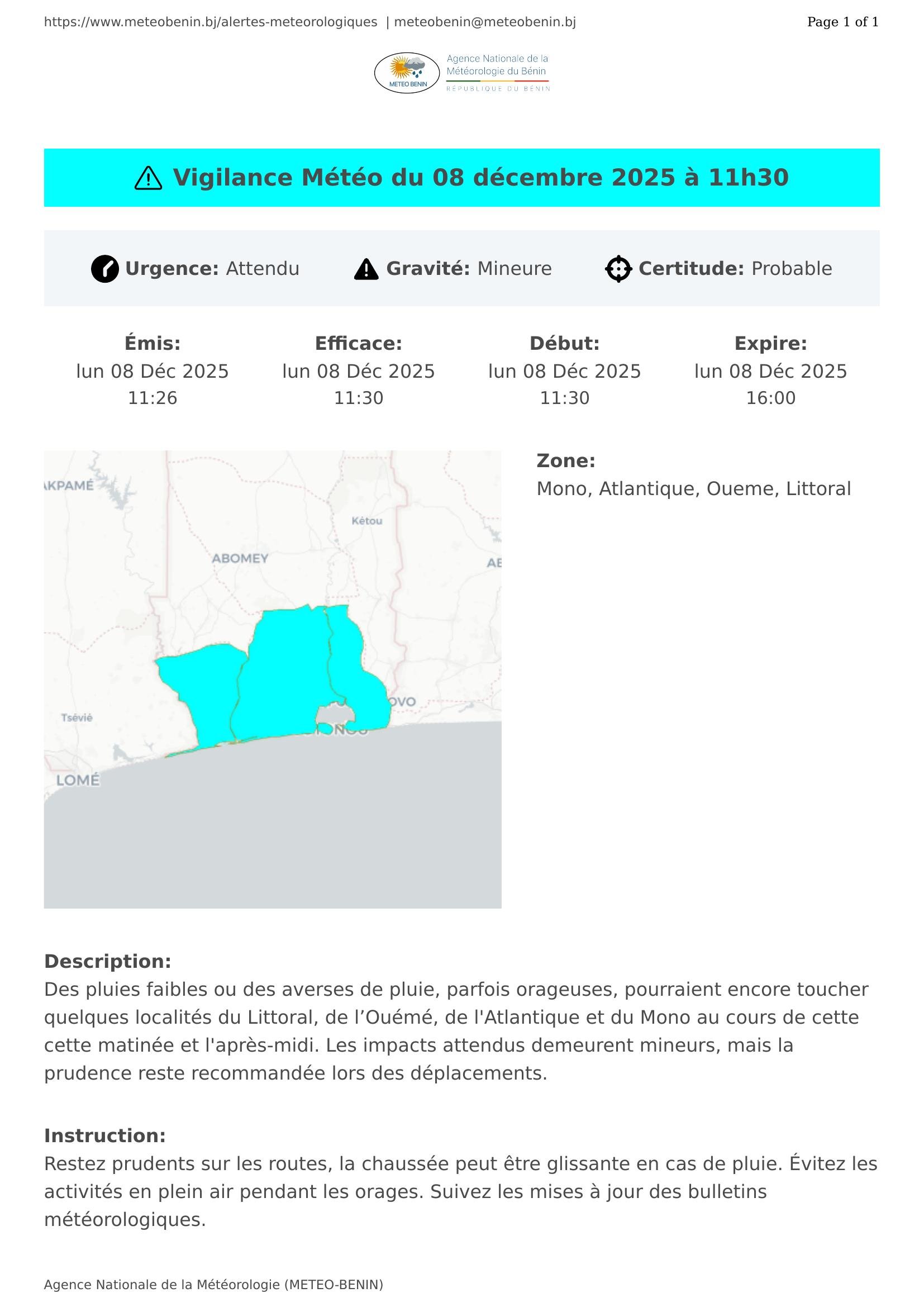 Des pluies faibles ou des averses de pluie, parfois orageuses, pourraient encore toucher quelques localités du Littoral, de l’Ouémé, de l'Atlantique et du Mono au cours de cette cette matinée et l'après-midi. Les impacts attendus demeurent mineurs, mais la prudence reste recommandée lors des déplacements.