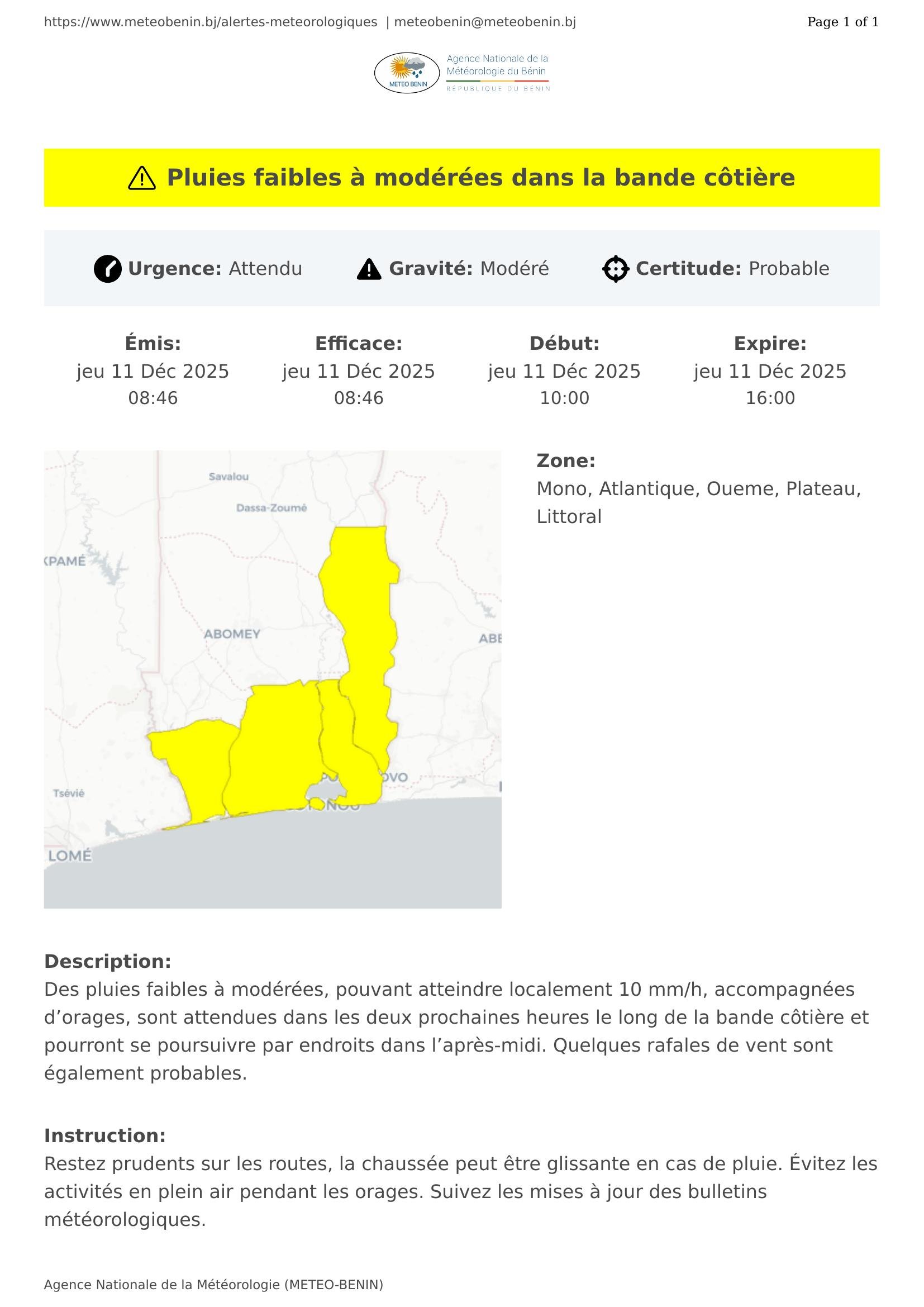 Des pluies faibles à modérées, pouvant atteindre localement 10 mm/h, accompagnées d’orages, sont attendues dans les deux prochaines heures le long de la bande côtière et pourront se poursuivre par endroits dans l’après-midi. Quelques rafales de vent sont également probables.