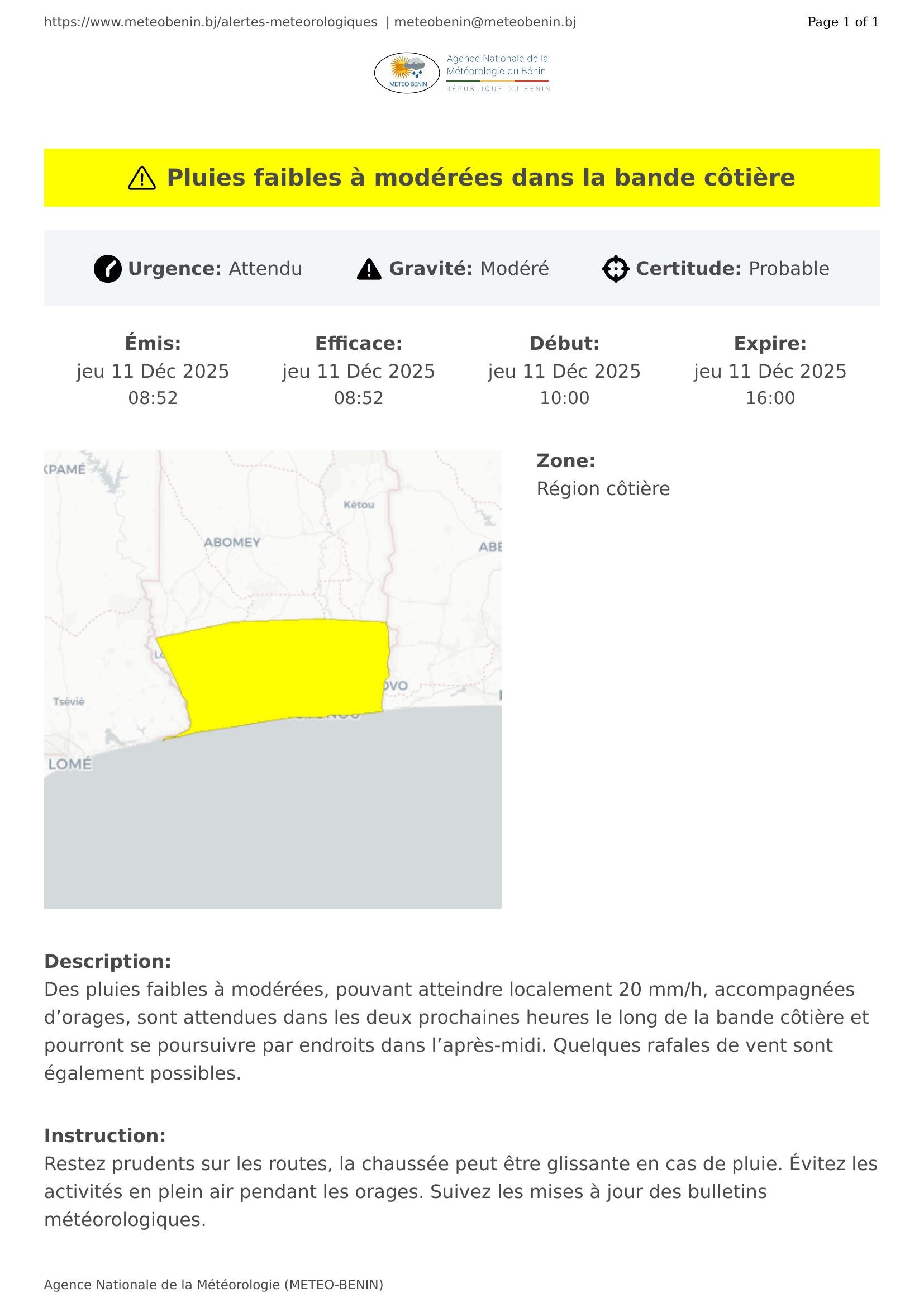 Pluies faibles à modérées dans la bande côtière