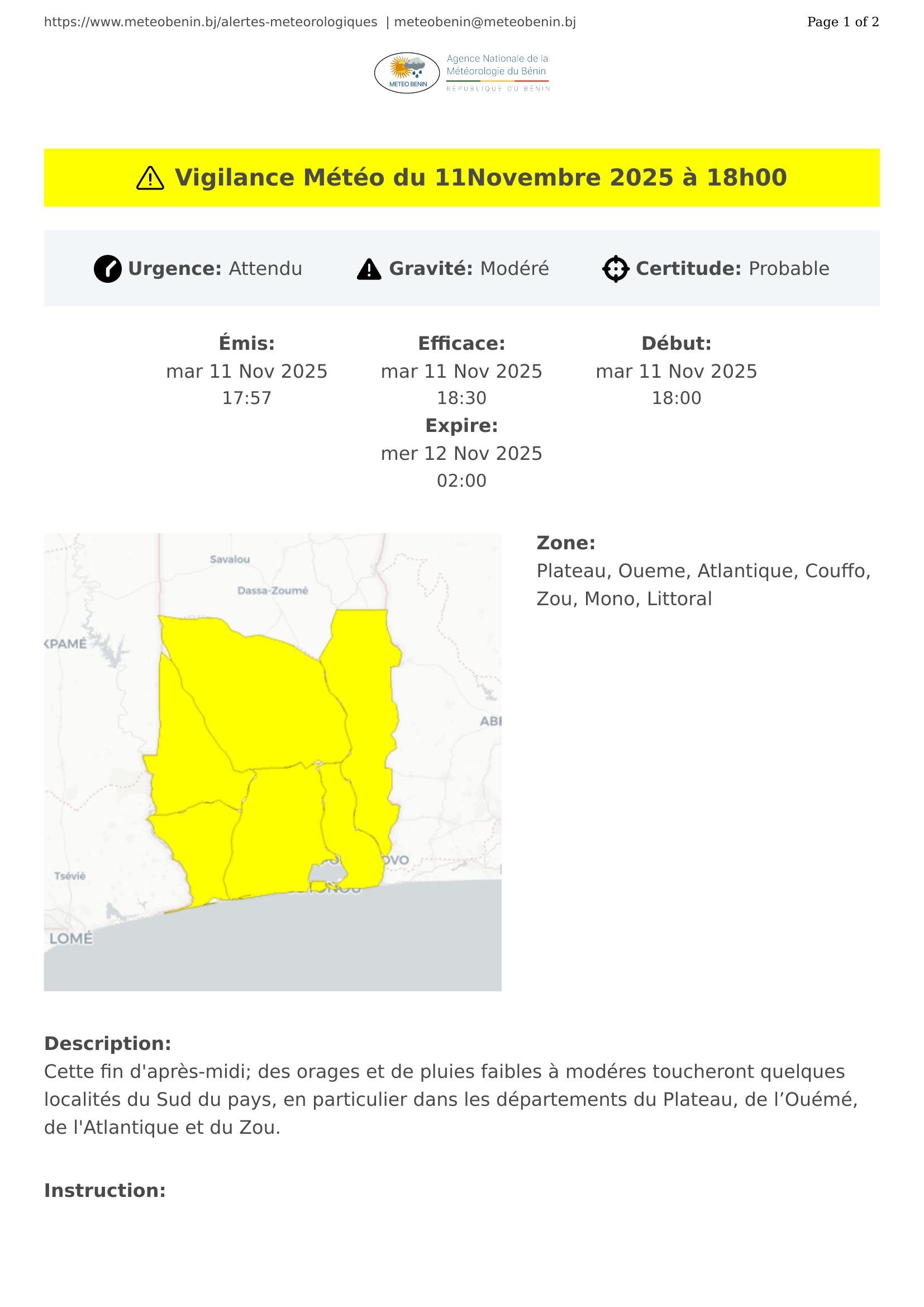Cette fin d'après-midi; des orages et de pluies faibles à modéres toucheront quelques localités du Sud du pays, en particulier dans les départements du Plateau, de l’Ouémé, de l'Atlantique et du Zou.