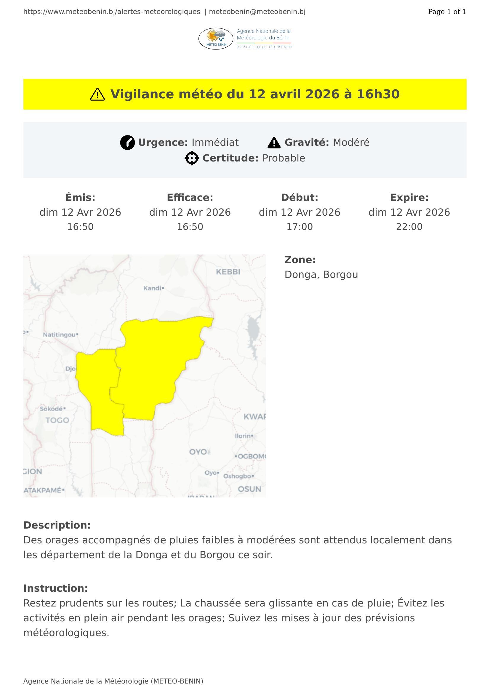 Des orages accompagnés de pluies faibles à modérées sont attendus localement dans les département de la Donga et du Borgou ce soir.