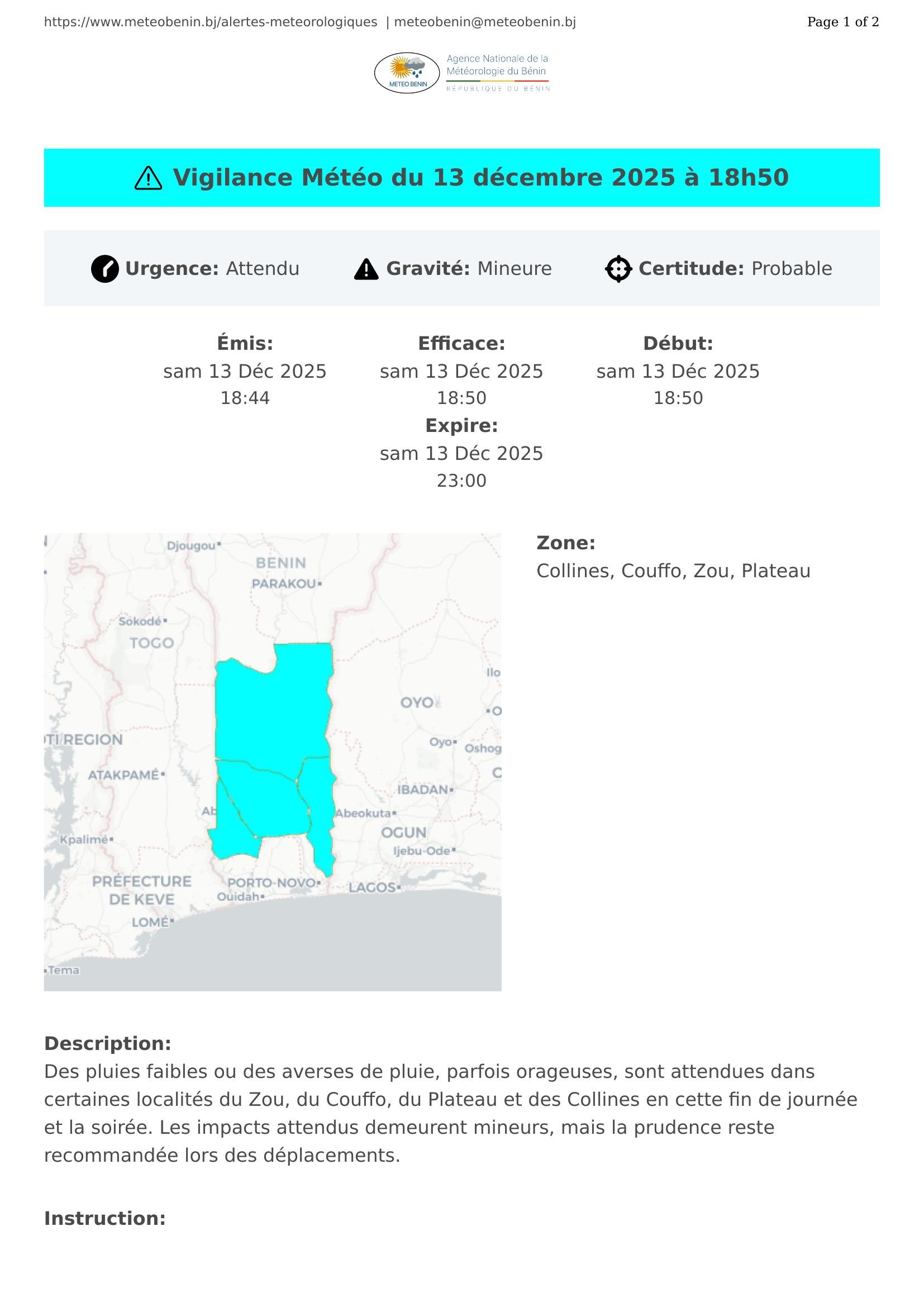 Des pluies faibles ou des averses de pluie, parfois orageuses, sont attendues dans certaines localités du Zou, du Couffo, du Plateau et des Collines en cette fin de journée et la soirée. Les impacts attendus demeurent mineurs, mais la prudence reste recommandée lors des déplacements.