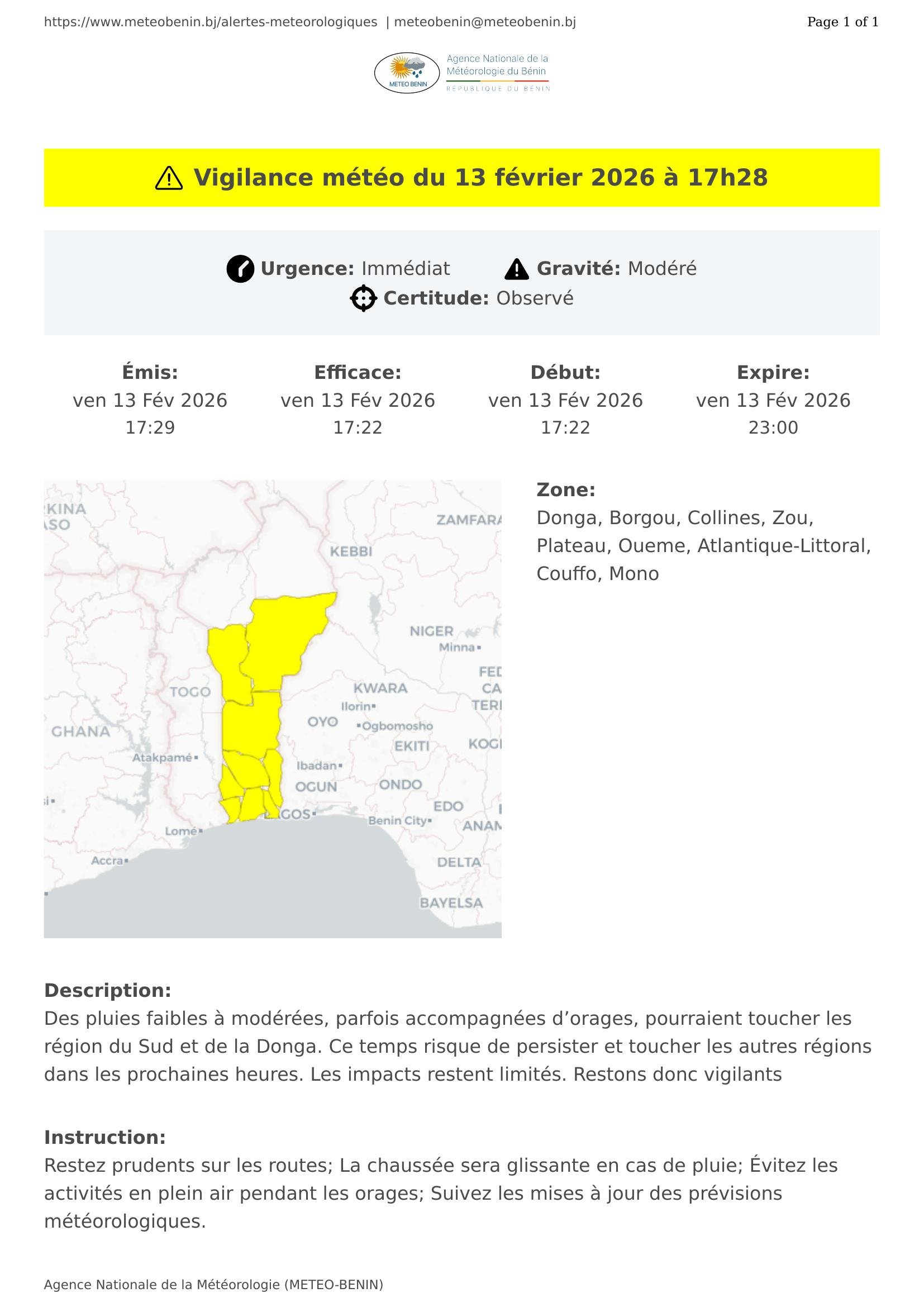 Des pluies faibles à modérées, parfois accompagnées d’orages, pourraient toucher les région du Sud et de la Donga. Ce temps risque de persister et toucher les autres régions dans les prochaines heures. Les impacts restent limités. Restons donc vigilants