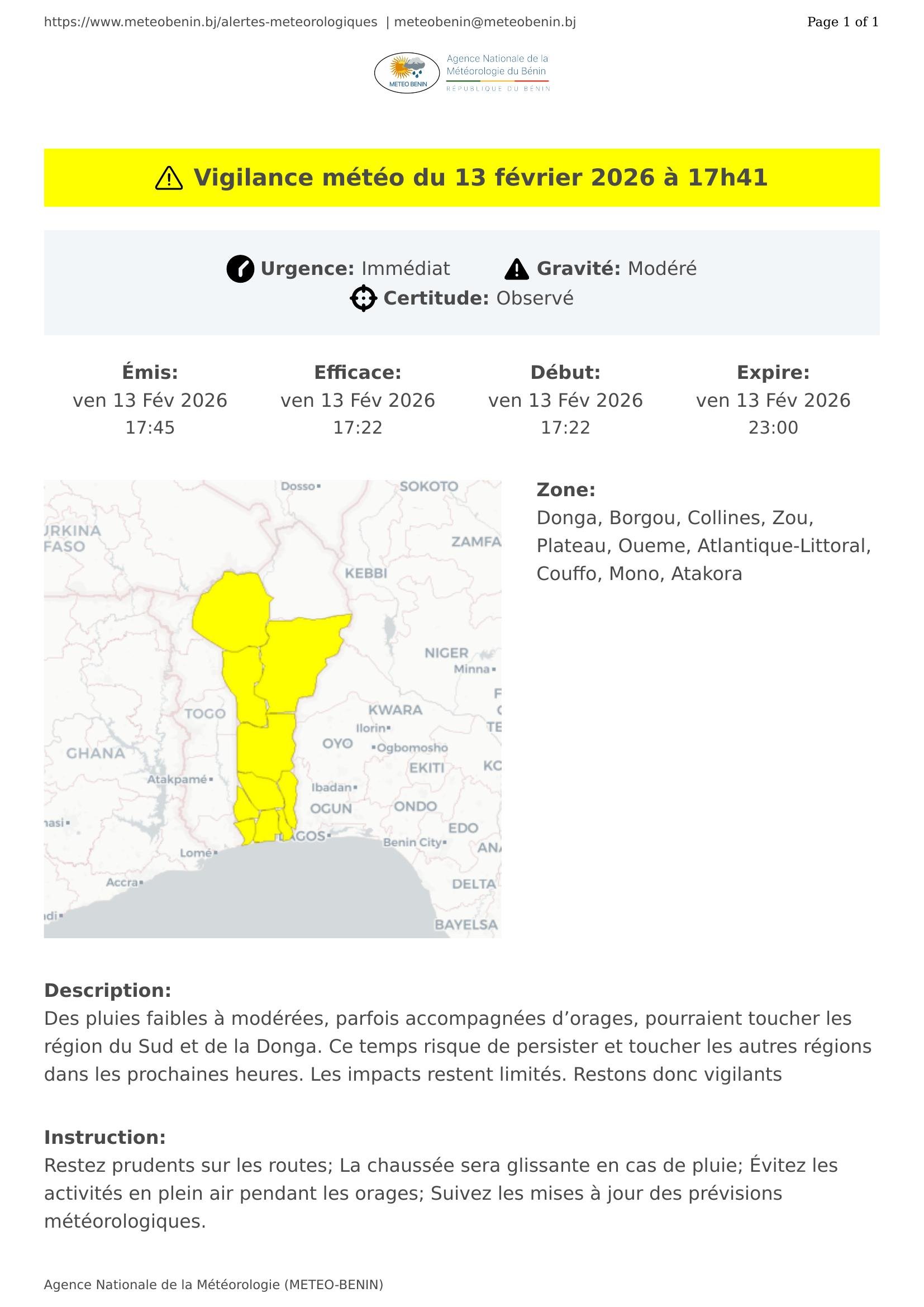 Des pluies faibles à modérées, parfois accompagnées d’orages, pourraient toucher les région du Sud et de la Donga. Ce temps risque de persister et toucher les autres régions dans les prochaines heures. Les impacts restent limités. Restons donc vigilants