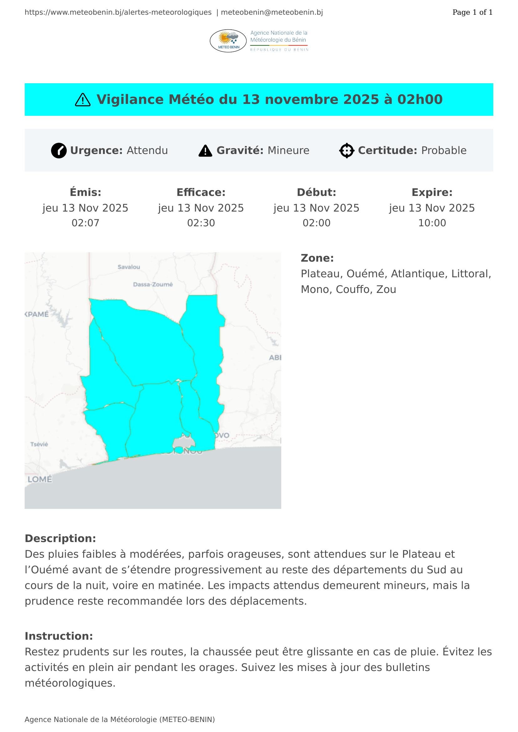 Des pluies faibles à modérées, parfois orageuses, sont attendues sur le Plateau et l’Ouémé avant de s’étendre progressivement au reste des départements du Sud au cours de la nuit, voire en matinée. Les impacts attendus demeurent mineurs, mais la prudence reste recommandée lors des déplacements.