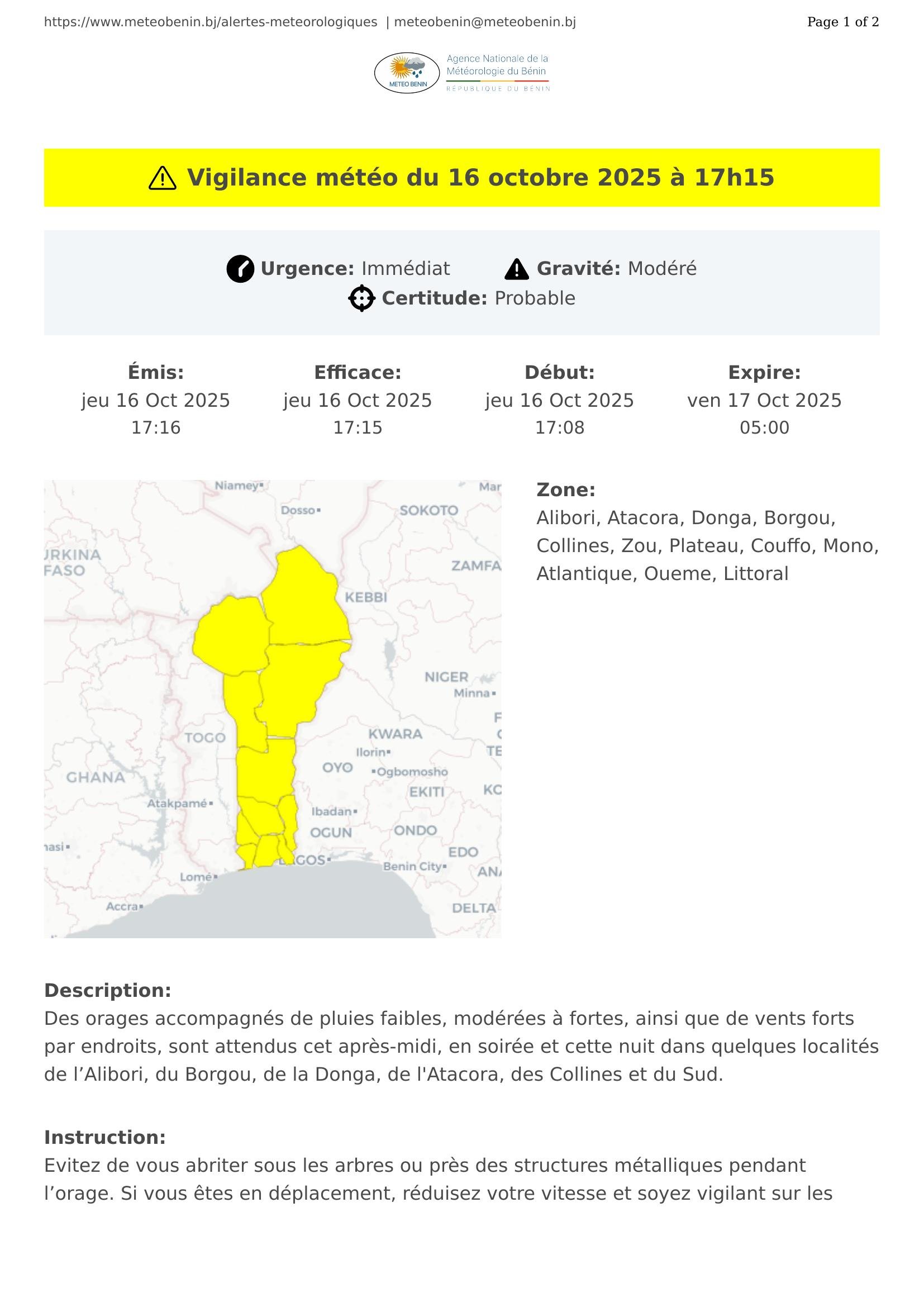 Des orages accompagnés de pluies faibles, modérées à fortes, ainsi que de vents forts par endroits, sont attendus cet après-midi, en soirée et cette nuit dans quelques localités de l’Alibori, du Borgou, de la Donga, de l'Atacora, des Collines et du Sud.