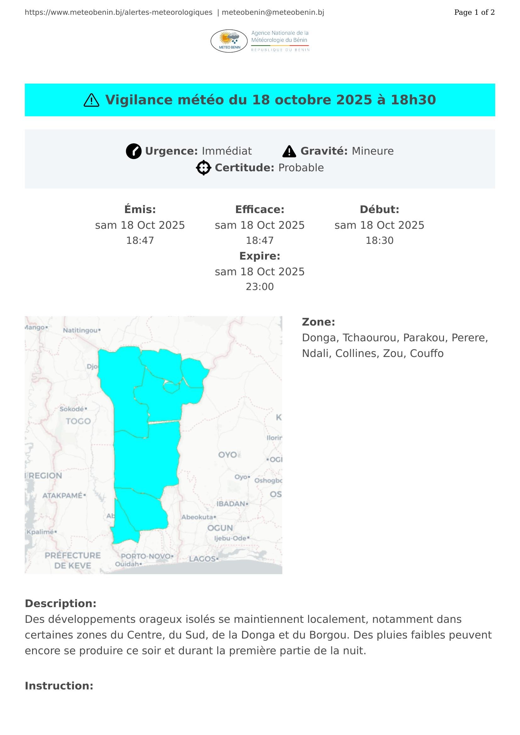 Des développements orageux isolés se maintiennent localement, notamment dans certaines zones du Centre, du Sud, de la Donga et du Borgou. Des pluies faibles peuvent encore se produire ce soir et durant la première partie de la nuit.