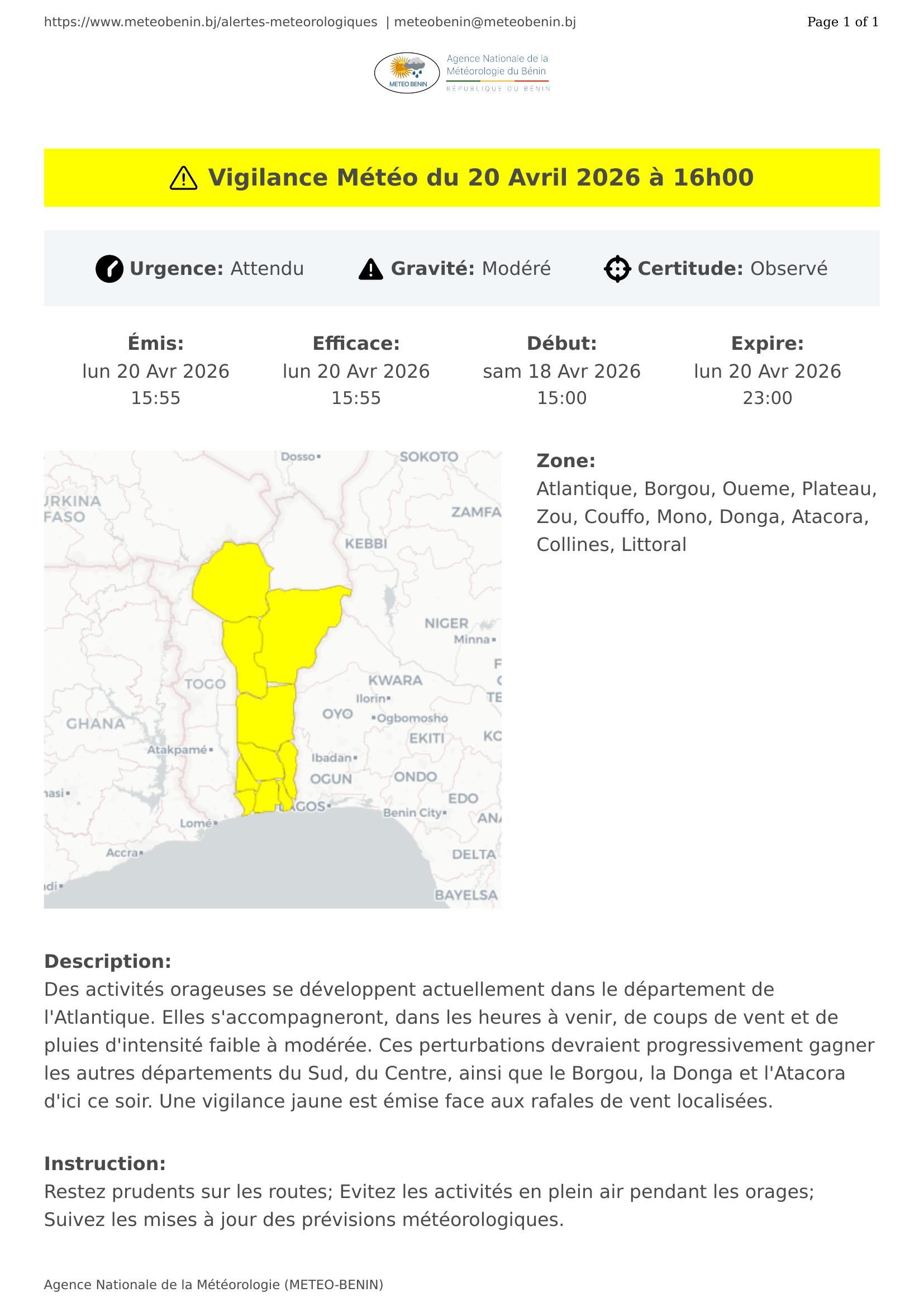 Des activités orageuses se développent actuellement dans le département de l'Atlantique. Elles s'accompagneront, dans les heures à venir, de coups de vent et de pluies d'intensité faible à modérée. Ces perturbations devraient progressivement gagner les autres départements du Sud, du Centre, ainsi que le Borgou, la Donga et l'Atacora d'ici ce soir. Une vigilance jaune est émise face aux rafales de vent localisées.