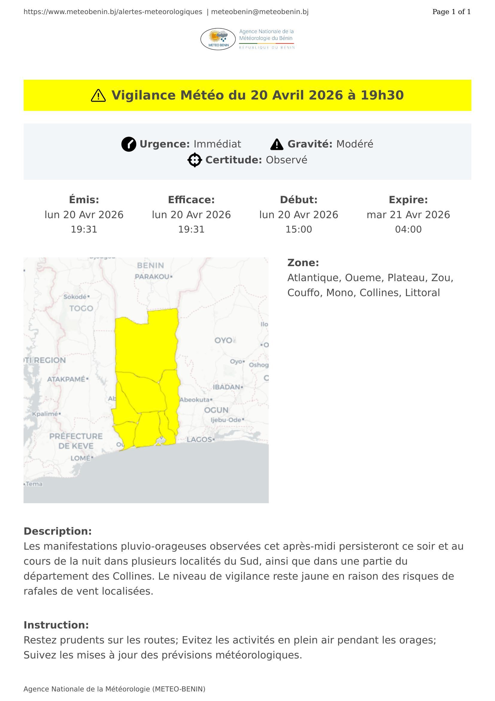 Les manifestations pluvio-orageuses observées cet après-midi persisteront ce soir et au cours de la nuit dans plusieurs localités du Sud, ainsi que dans une partie du département des Collines. Le niveau de vigilance reste jaune en raison des risques de rafales de vent localisées.