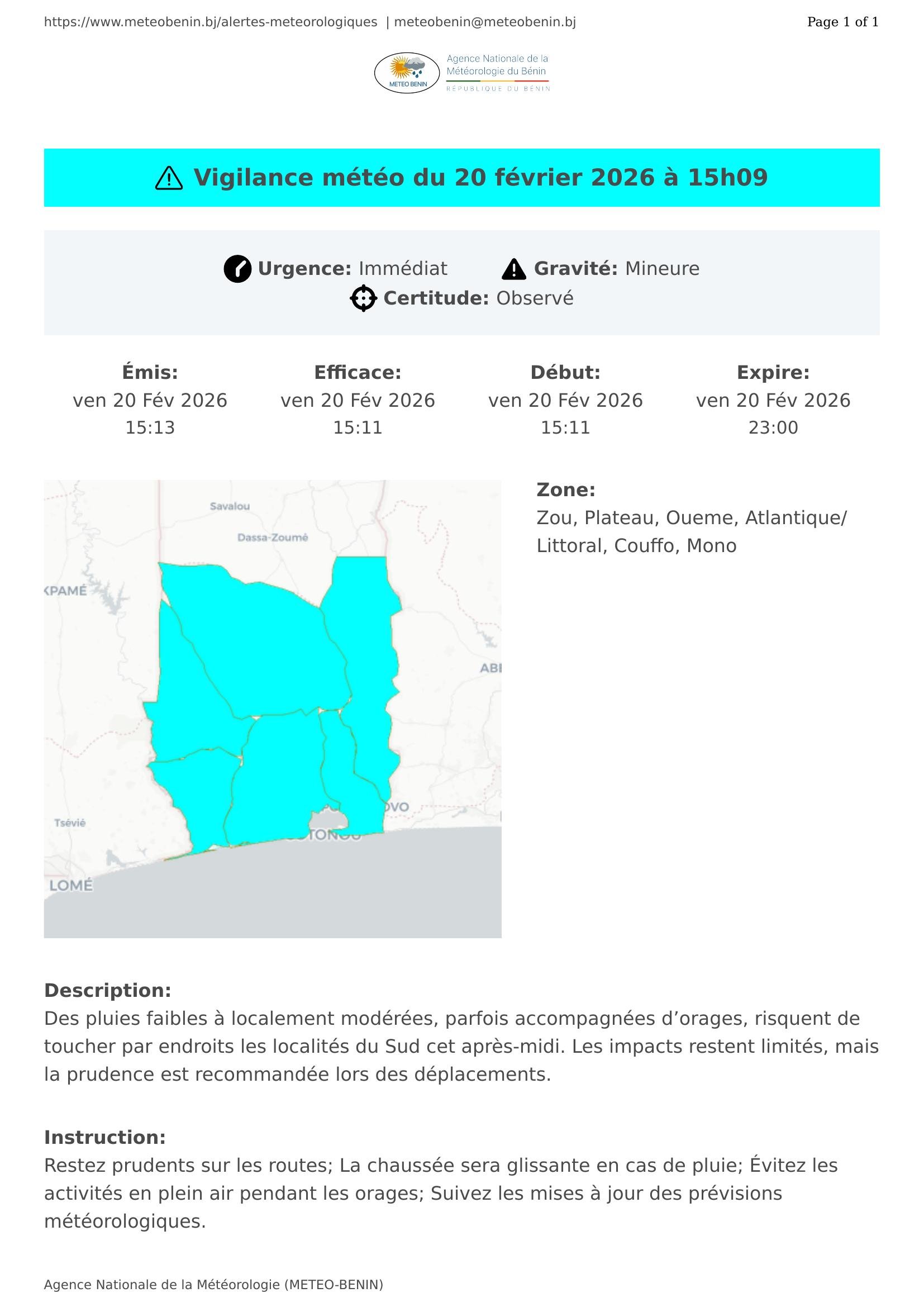 Des pluies faibles à localement modérées, parfois accompagnées d’orages, risquent de toucher par endroits les localités du Sud cet après-midi. Les impacts restent limités, mais la prudence est recommandée lors des déplacements.