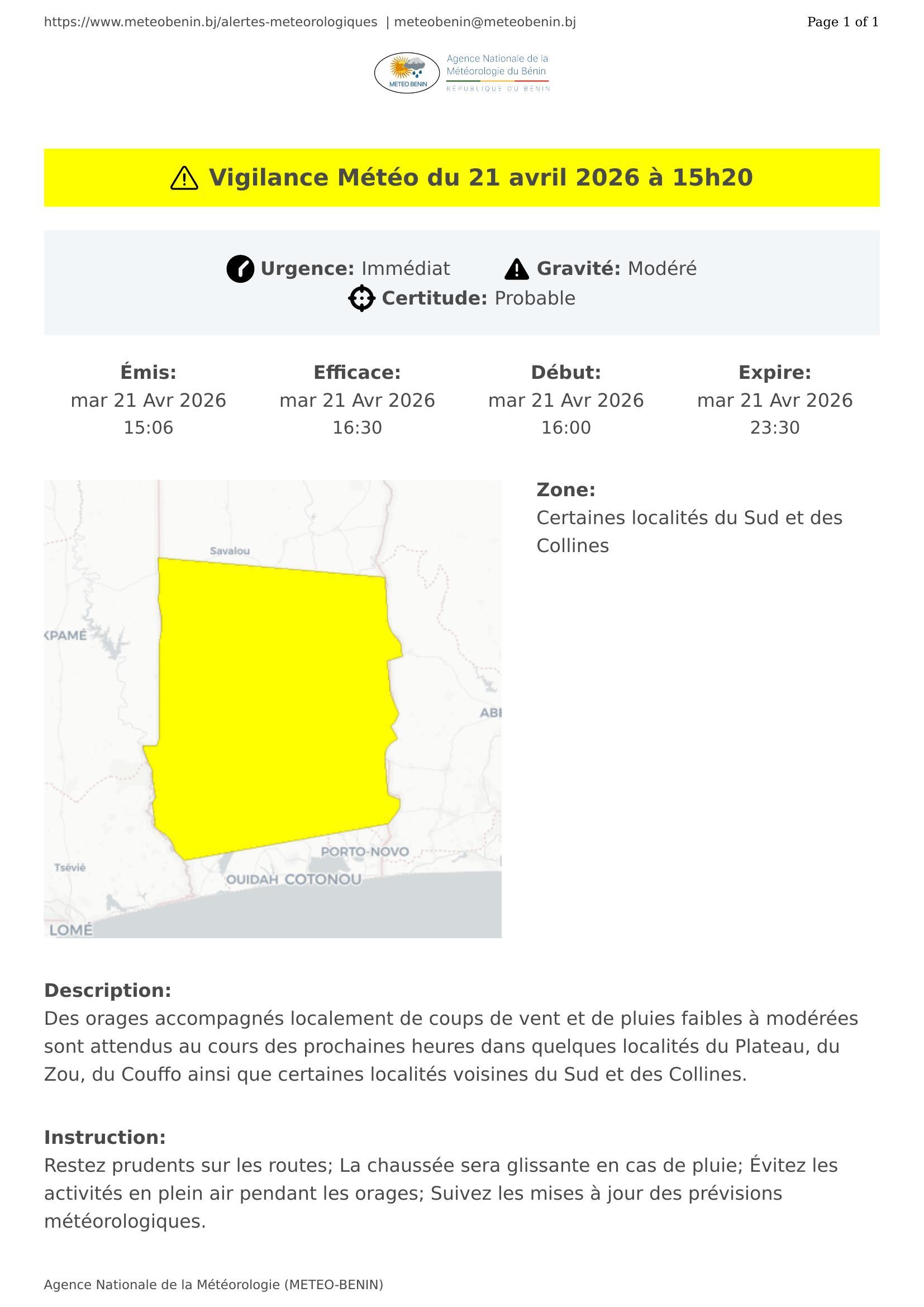 Des orages accompagnés localement de coups de vent et de pluies faibles à modérées sont attendus au cours des prochaines heures dans quelques localités du Plateau, du Zou, du Couffo ainsi que certaines localités voisines du Sud et des Collines.