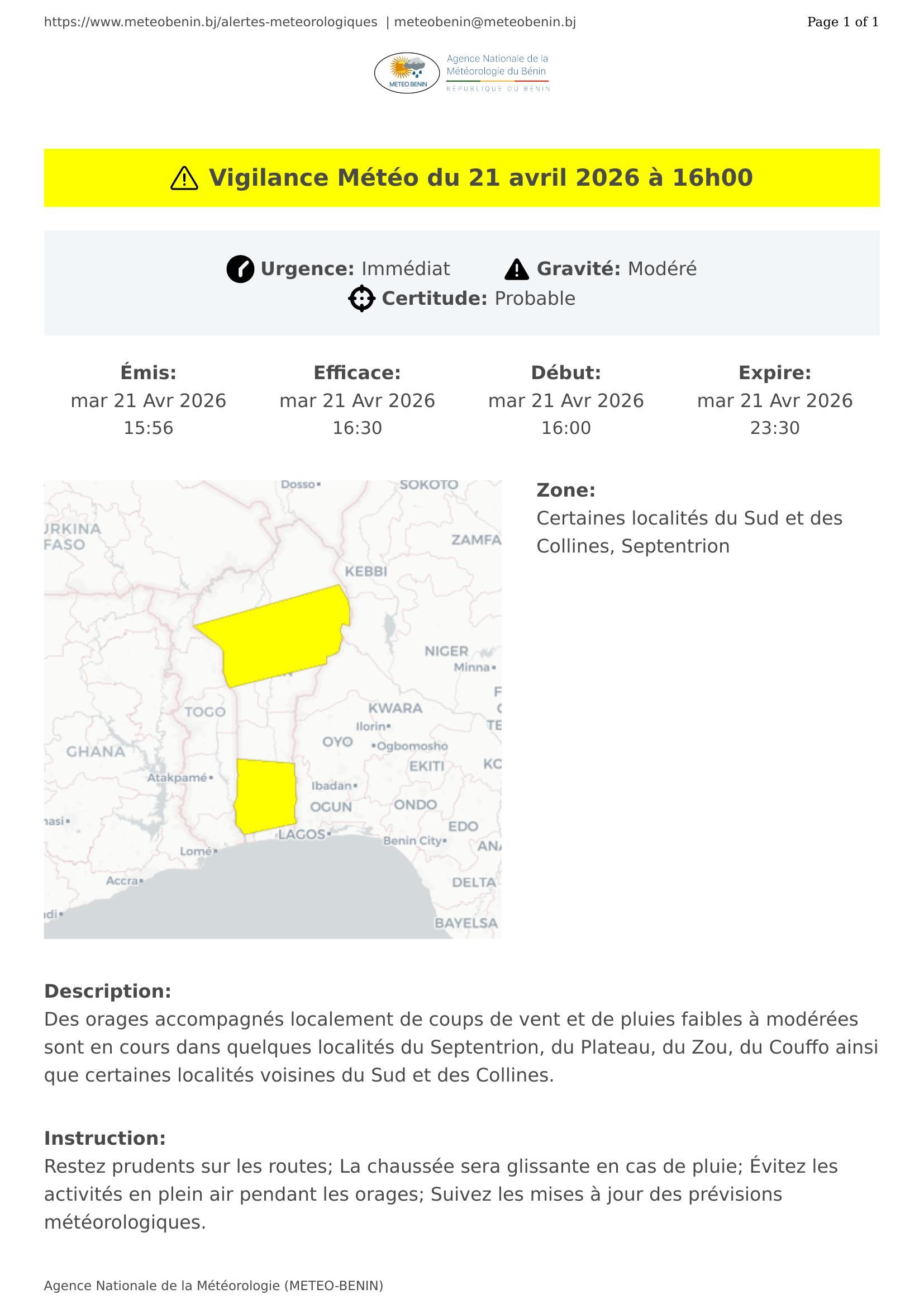 Des orages accompagnés localement de coups de vent et de pluies faibles à modérées sont en cours dans quelques localités du Septentrion, du Plateau, du Zou, du Couffo ainsi que certaines localités voisines du Sud et des Collines.