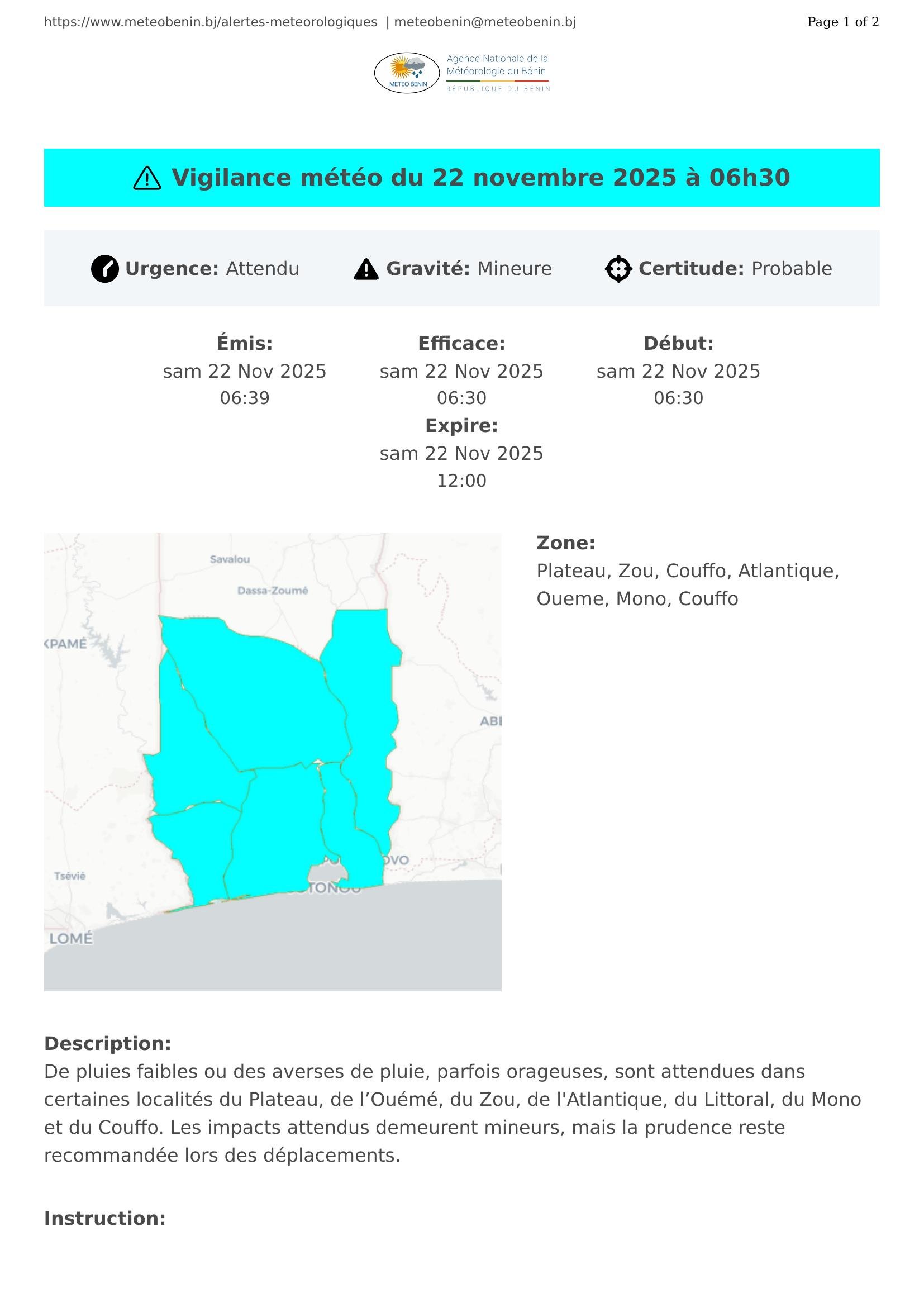 De pluies faibles ou des averses de pluie, parfois orageuses, sont attendues dans certaines localités du Plateau, de l’Ouémé, du Zou, de l'Atlantique, du Littoral, du Mono et du Couffo. Les impacts attendus demeurent mineurs, mais la prudence reste recommandée lors des déplacements.
