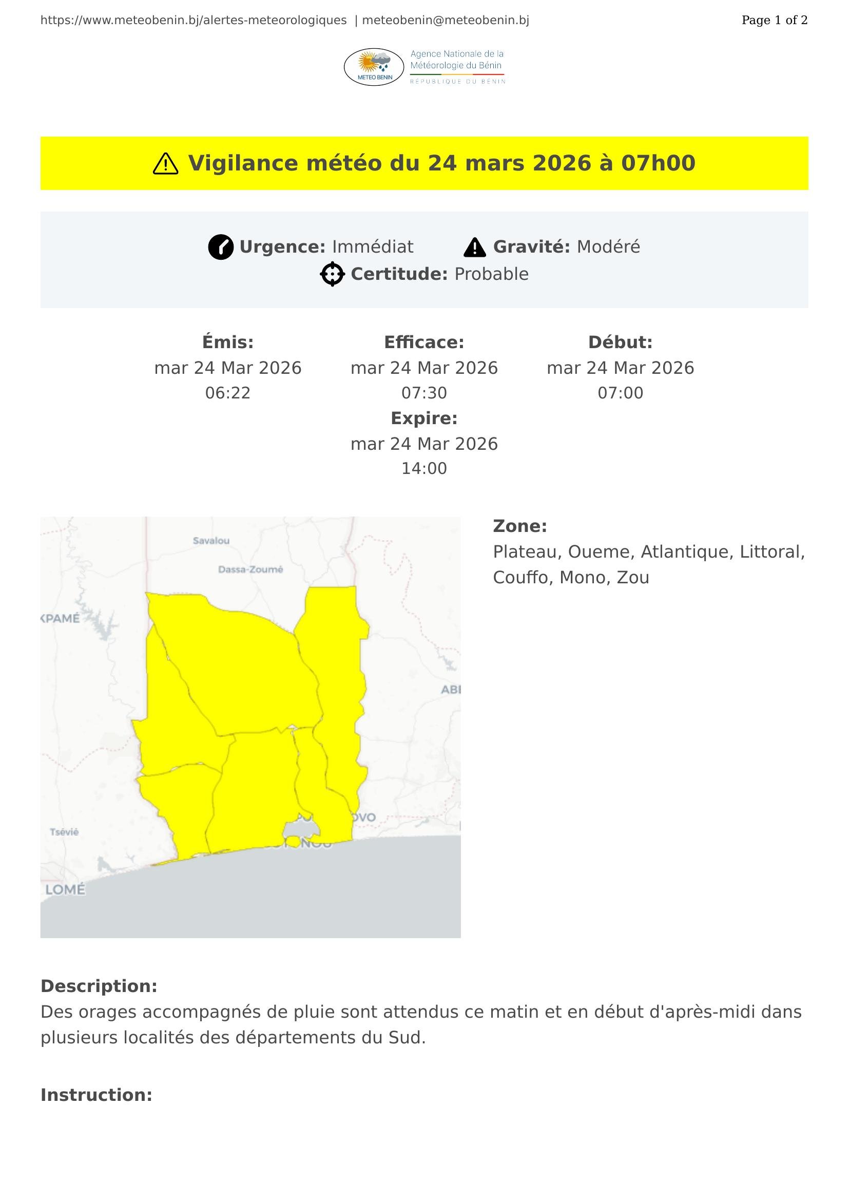 Des orages accompagnés de pluie sont attendus ce matin et en début d'après-midi dans plusieurs localités des départements du Sud.