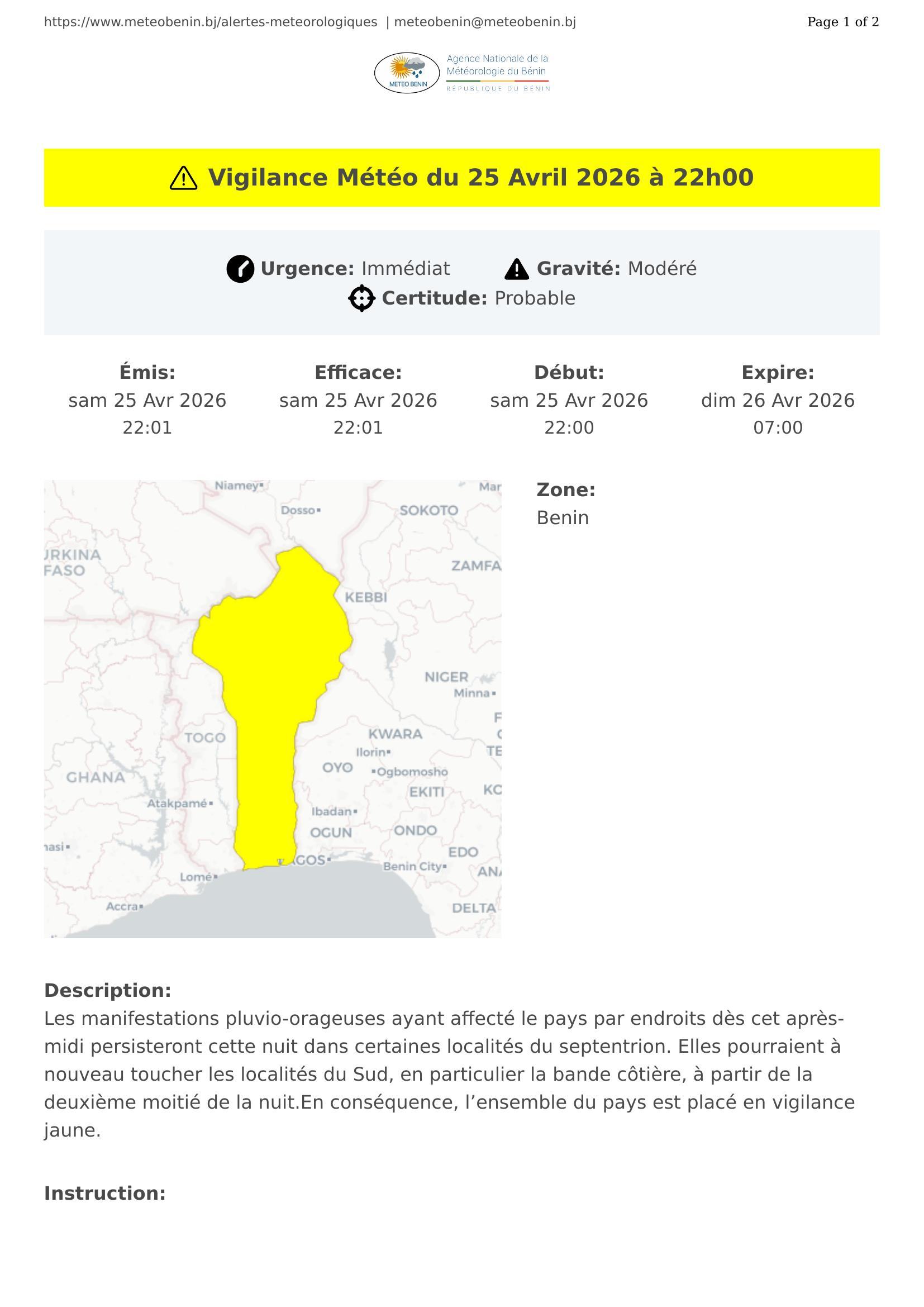 Vigilance Météo du 25 Avril 2026 à 22h00