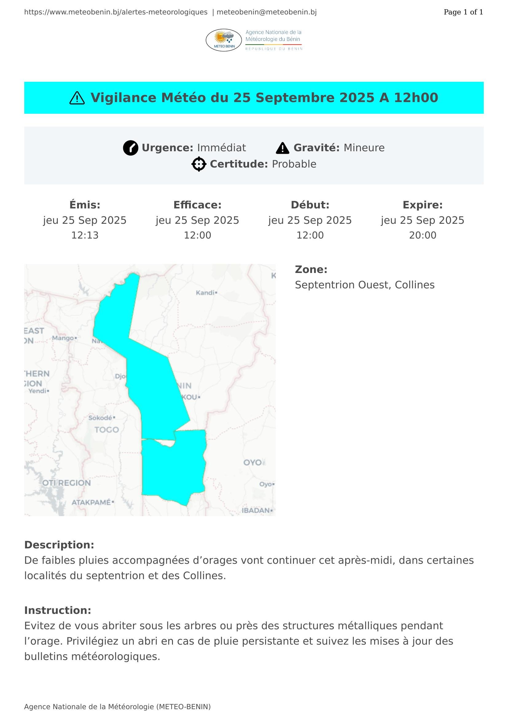 Vigilance Météo du 25 Septembre 2025 A 05h00