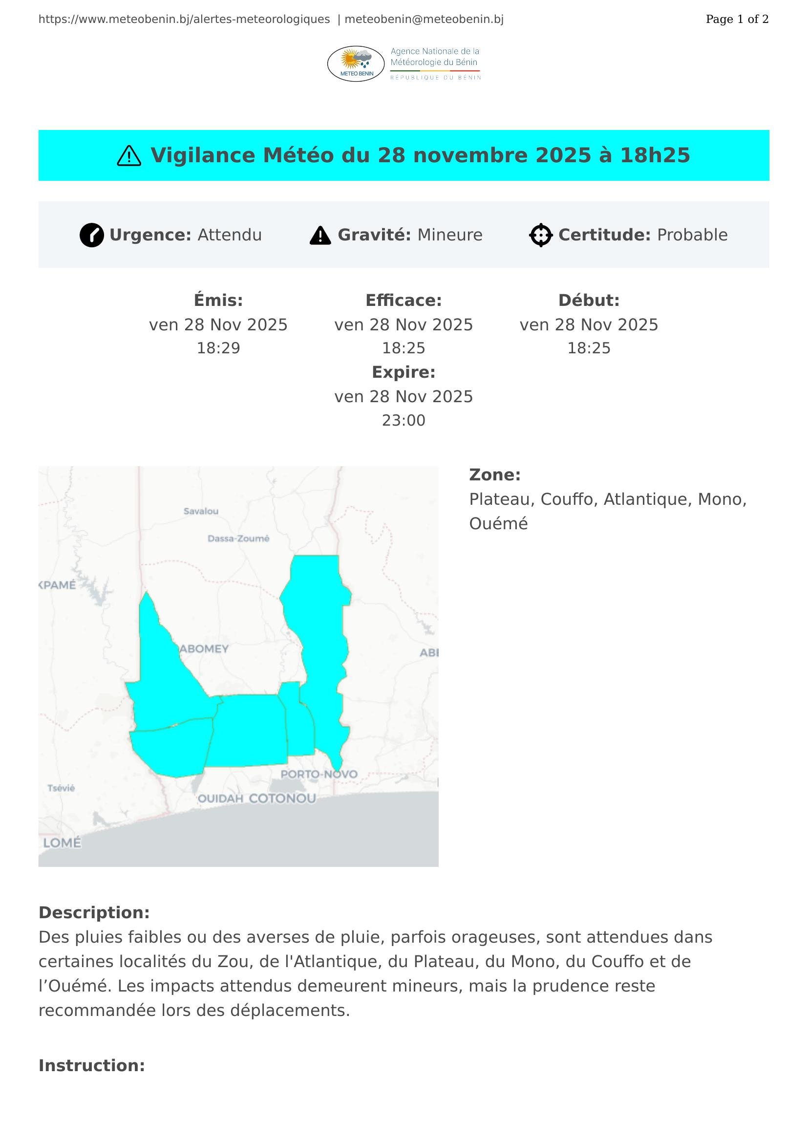 Des pluies faibles ou des averses de pluie, parfois orageuses, sont attendues dans certaines localités du Zou, de l'Atlantique, du Plateau, du Mono, du Couffo et de l’Ouémé. Les impacts attendus demeurent mineurs, mais la prudence reste recommandée lors des déplacements.