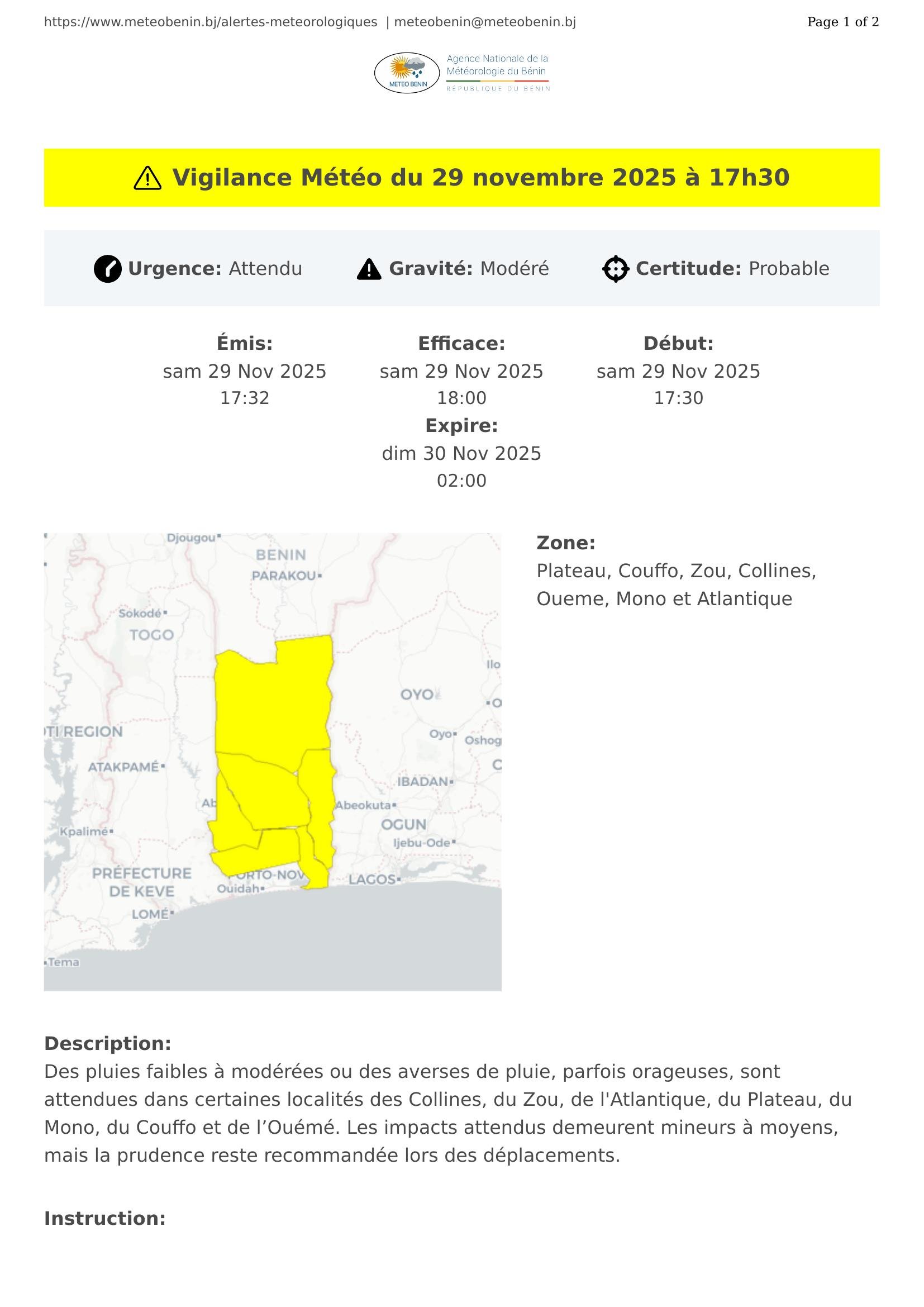 Des pluies faibles à modérées ou des averses de pluie, parfois orageuses, sont attendues dans certaines localités des Collines, du Zou, de l'Atlantique, du Plateau, du Mono, du Couffo et de l’Ouémé. Les impacts attendus demeurent mineurs à moyens, mais la prudence reste recommandée lors des déplacements.