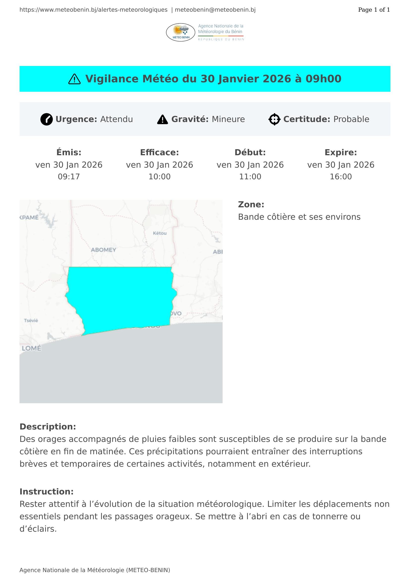 Vigilance Météo du 30 Janvier 2026 à 09h00