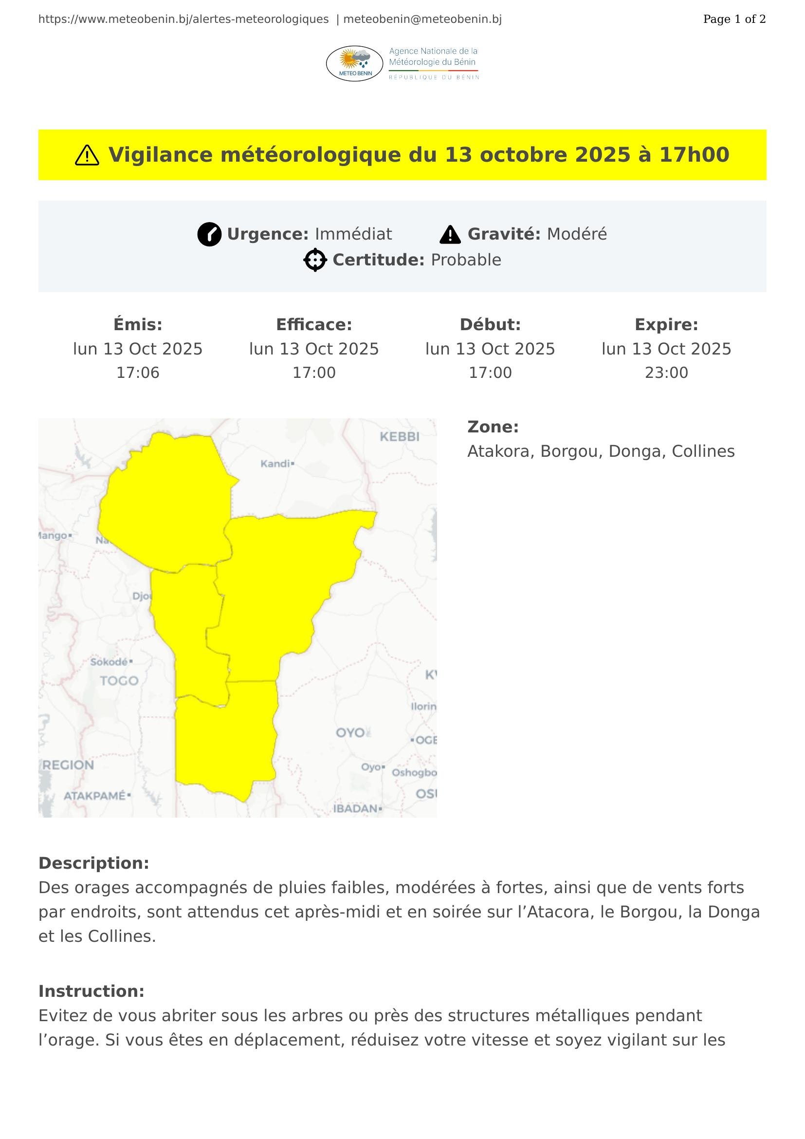 Des orages accompagnés de pluies faibles, modérées à fortes, ainsi que de vents forts par endroits, sont attendus cet après-midi et en soirée sur l’Atacora, le Borgou, la Donga et les Collines.