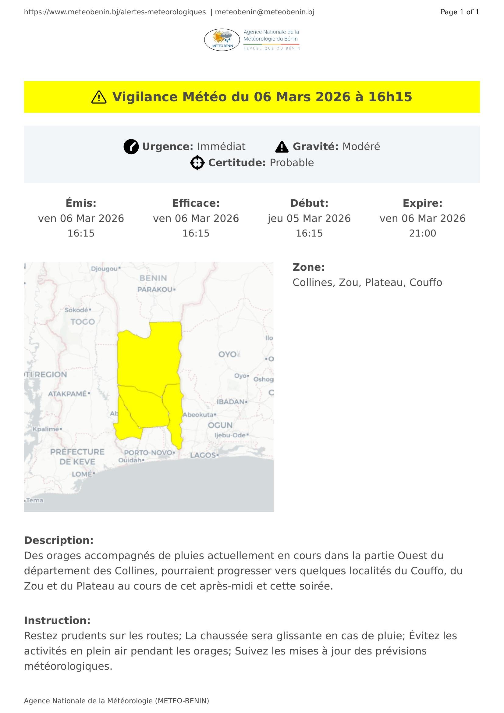 Des orages accompagnés de pluies actuellement en cours dans la partie Ouest du département des Collines, pourraient progresser vers quelques localités du Couffo, du Zou et du Plateau au cours de cet après-midi et cette soirée.