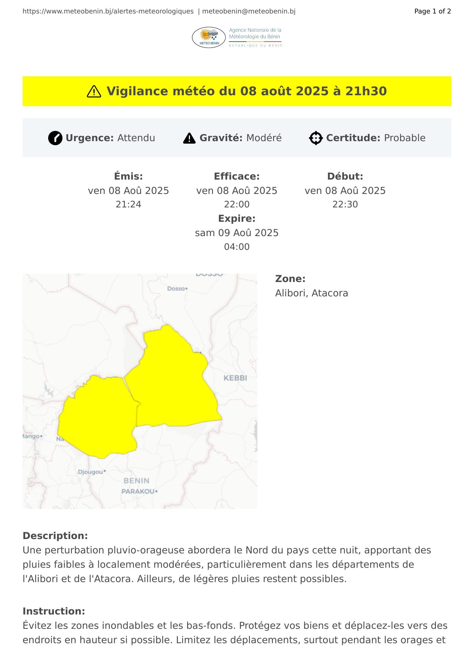 Une perturbation pluvio-orageuse abordera le Nord du pays cette nuit, apportant des pluies faibles à localement modérées, particulièrement dans les départements de l'Alibori et de l'Atacora. Ailleurs, de légères pluies restent possibles.