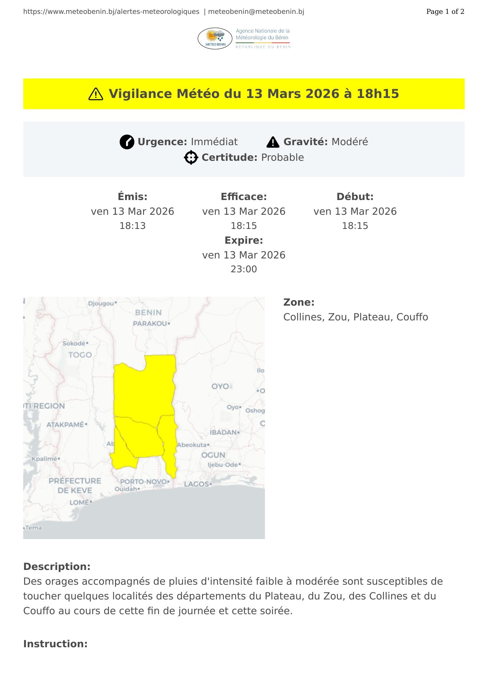 Des orages accompagnés de pluies d'intensité faible à modérée sont susceptibles de toucher quelques localités des départements du Plateau, du Zou, des Collines et du Couffo au cours de cette fin de journée et cette soirée.