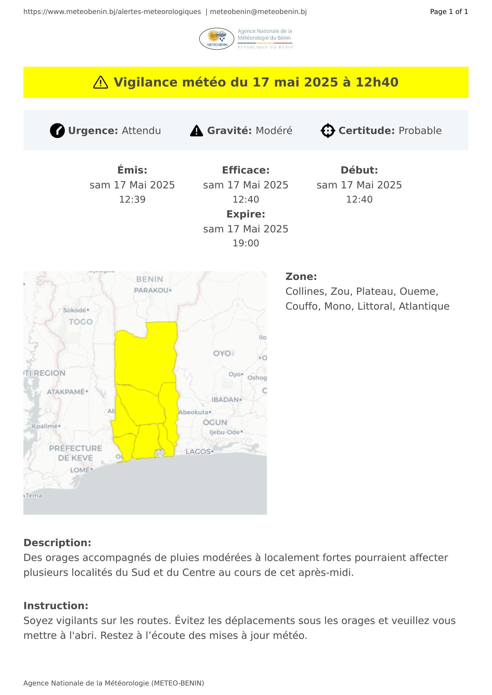 Des orages accompagnés de pluies modérées à localement fortes pourraient affecter plusieurs localités du Sud et du Centre au cours de cet après-midi.