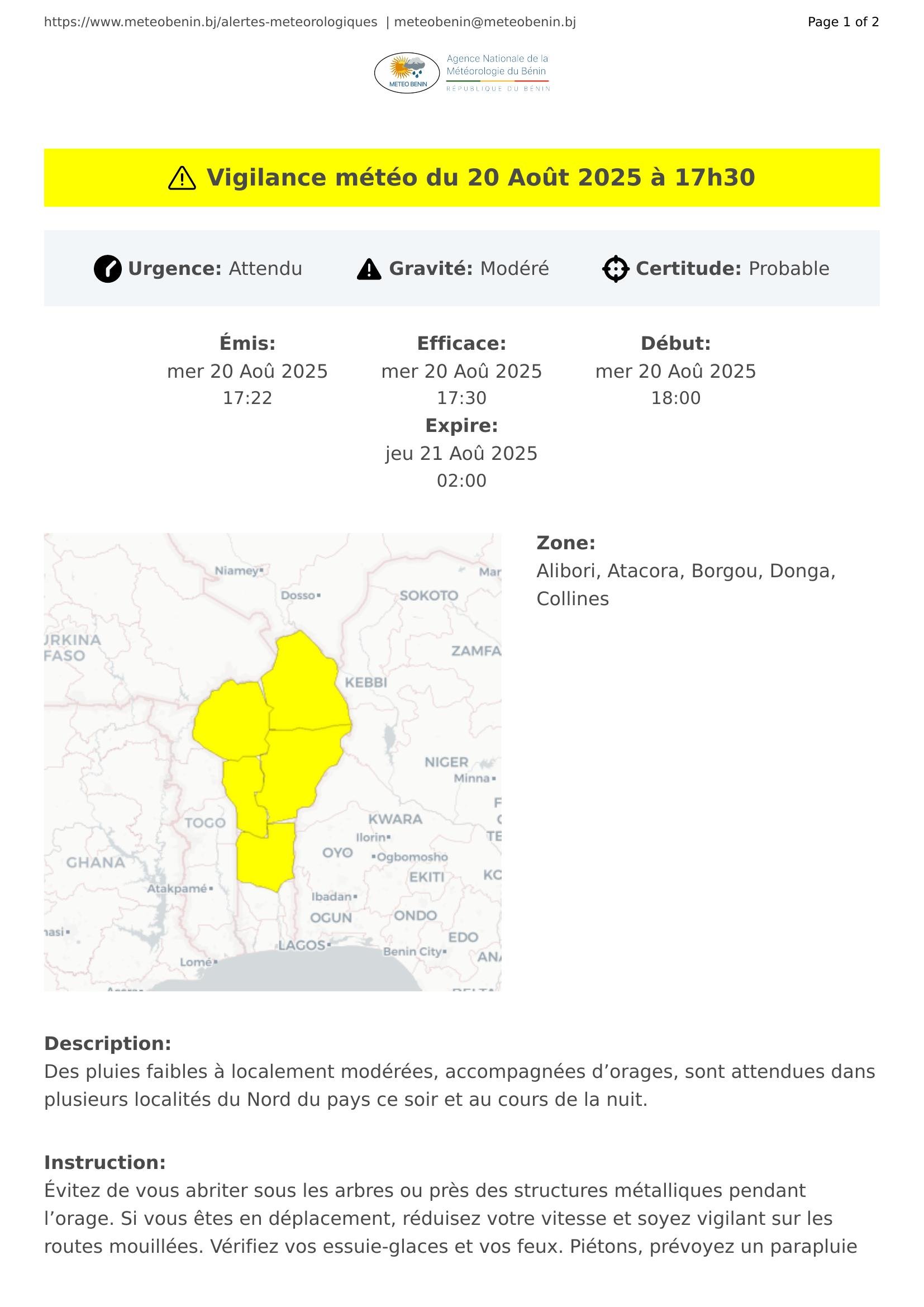 Des pluies faibles à localement modérées, accompagnées d’orages, sont attendues dans plusieurs localités du Nord du pays ce soir et au cours de la nuit.