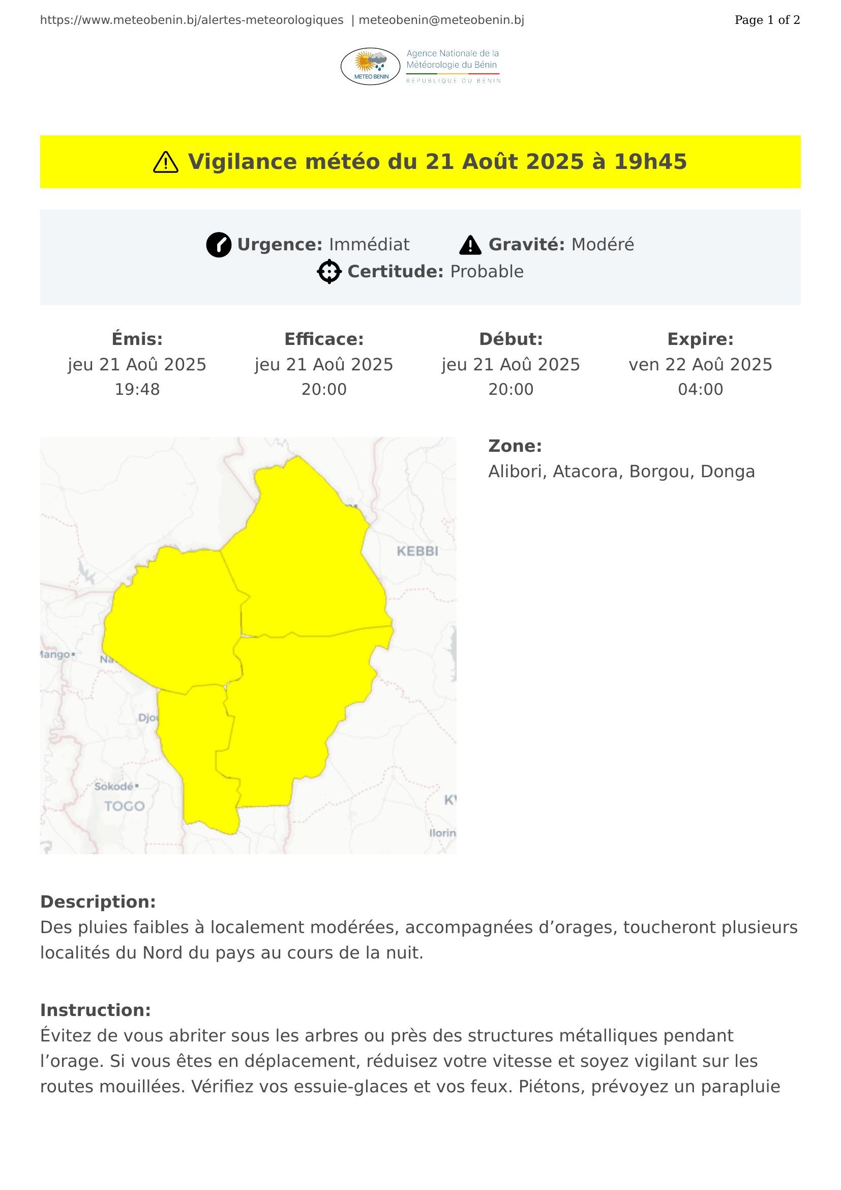 Des pluies faibles à localement modérées, accompagnées d’orages, toucheront plusieurs localités du Nord du pays au cours de la nuit.