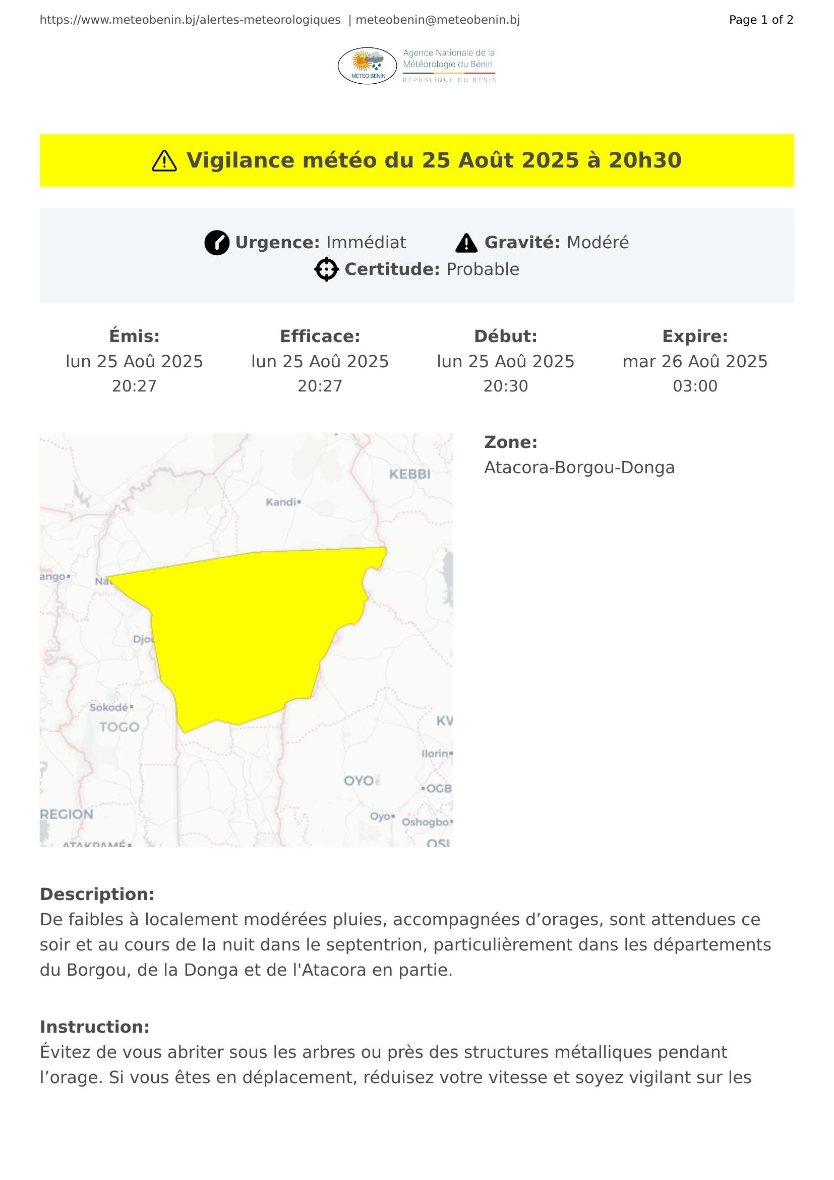 De faibles à localement modérées pluies, accompagnées d’orages, sont attendues ce soir et au cours de la nuit dans le septentrion, particulièrement dans les départements du Borgou, de la Donga et de l'Atacora en partie.