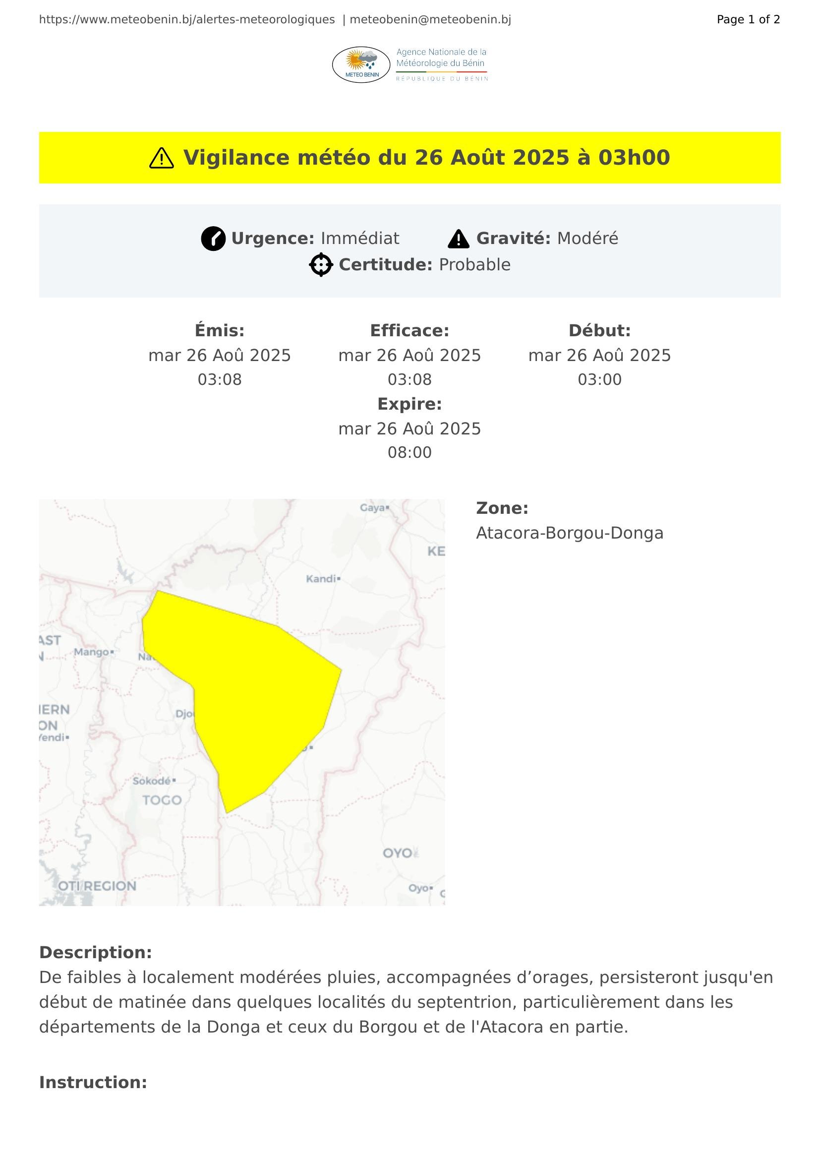 De faibles à localement modérées pluies, accompagnées d’orages, persisteront jusqu'en début de matinée dans quelques localités du septentrion, particulièrement dans les départements de la Donga et ceux du Borgou et de l'Atacora en partie.
