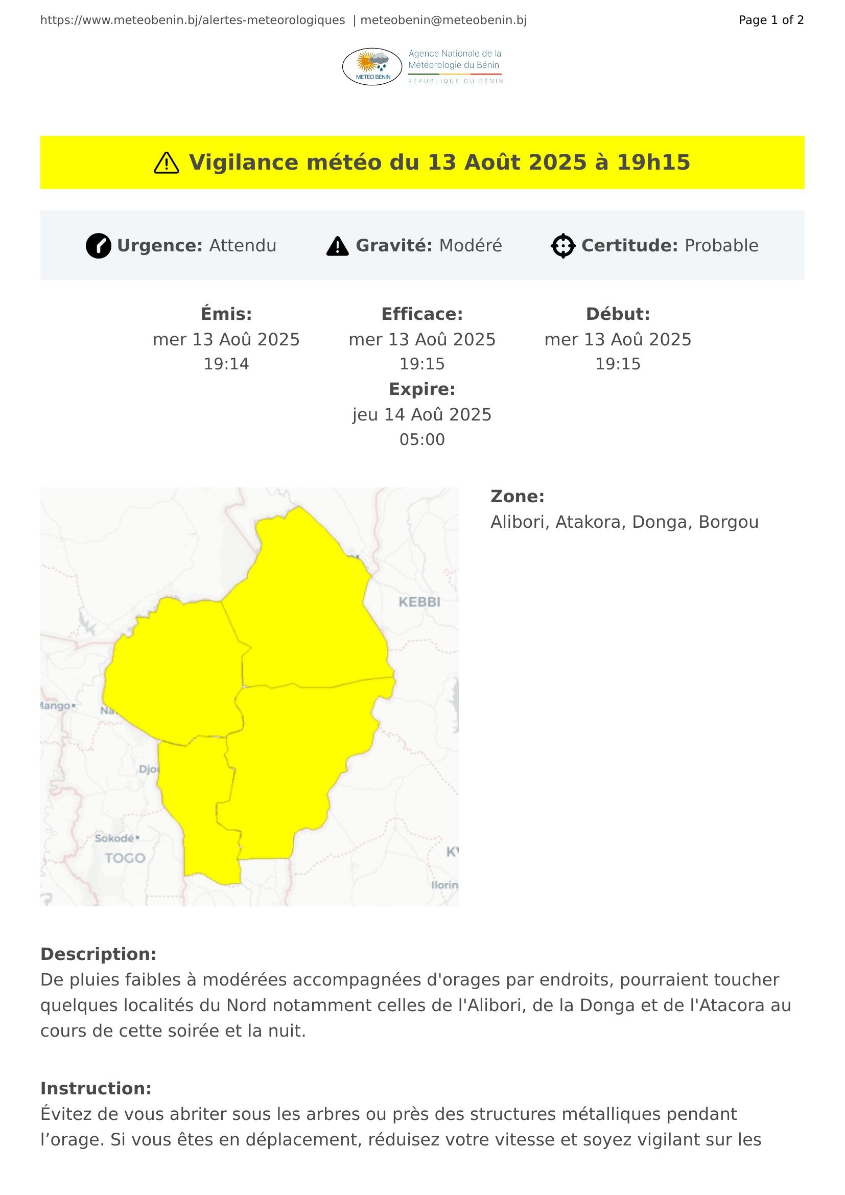 De pluies faibles à modérées accompagnées d'orages par endroits, pourraient toucher quelques localités du Nord notamment celles de l'Alibori, de la Donga et de l'Atacora au cours de cette soirée et la nuit.