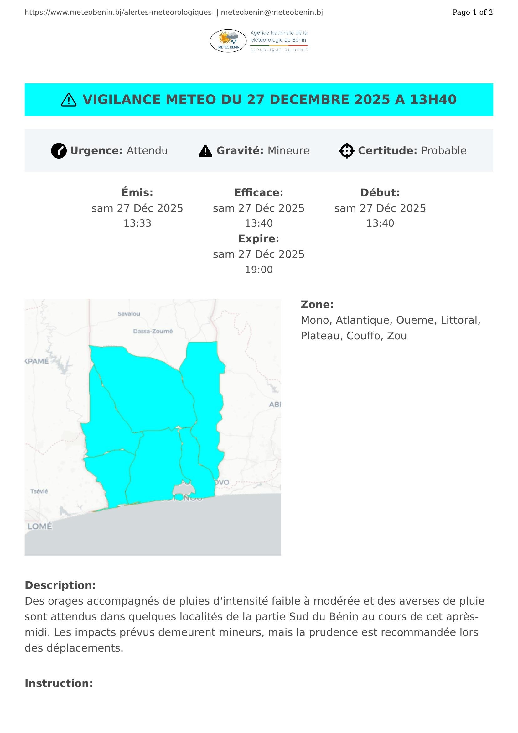 Des orages accompagnés de pluies d'intensité faible à modérée et des averses de pluie sont attendus dans quelques localités de la partie Sud du Bénin au cours de cet après-midi. Les impacts prévus demeurent mineurs, mais la prudence est recommandée lors des déplacements.