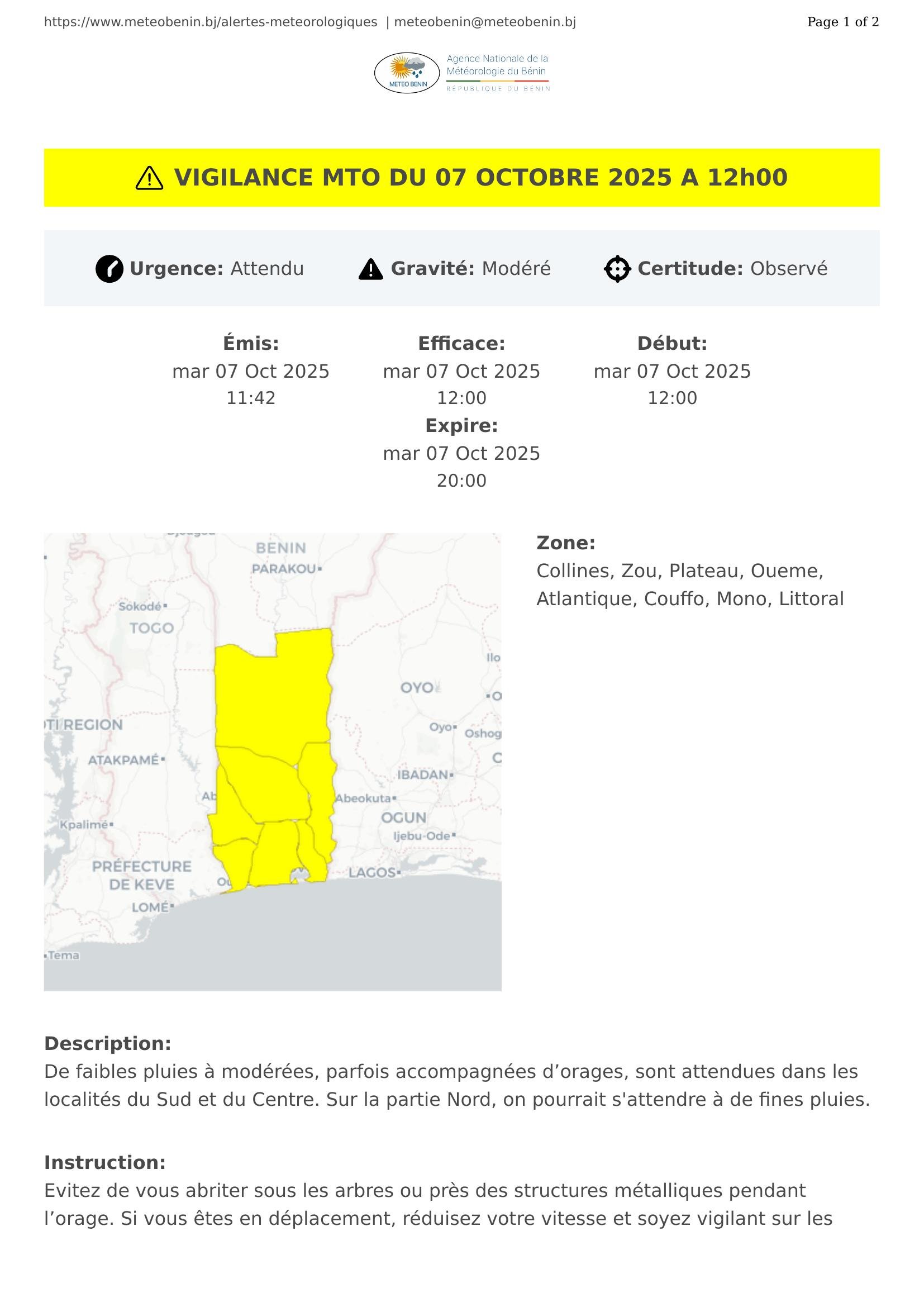 VIGILANCE MTO DU 07 OCTOBRE 2025 A 04h00Pluie orageuse dans le Sud et le Centre