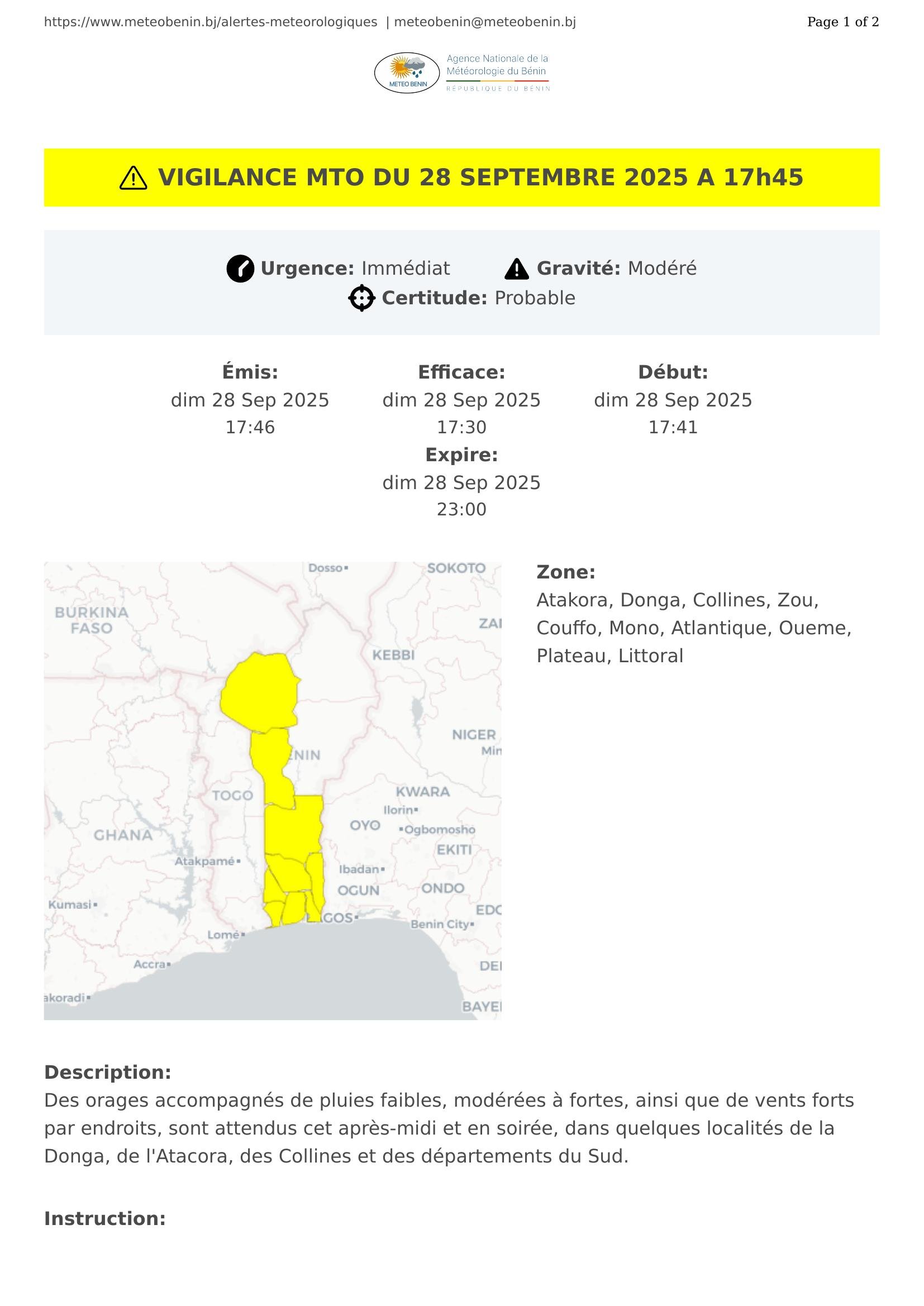 Des orages accompagnés de pluies faibles, modérées à fortes, ainsi que de vents forts par endroits, sont attendus cet après-midi et en soirée, dans quelques localités de la Donga, de l'Atacora, des Collines et des départements du Sud.